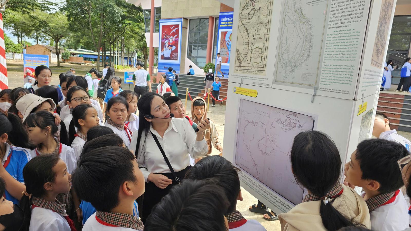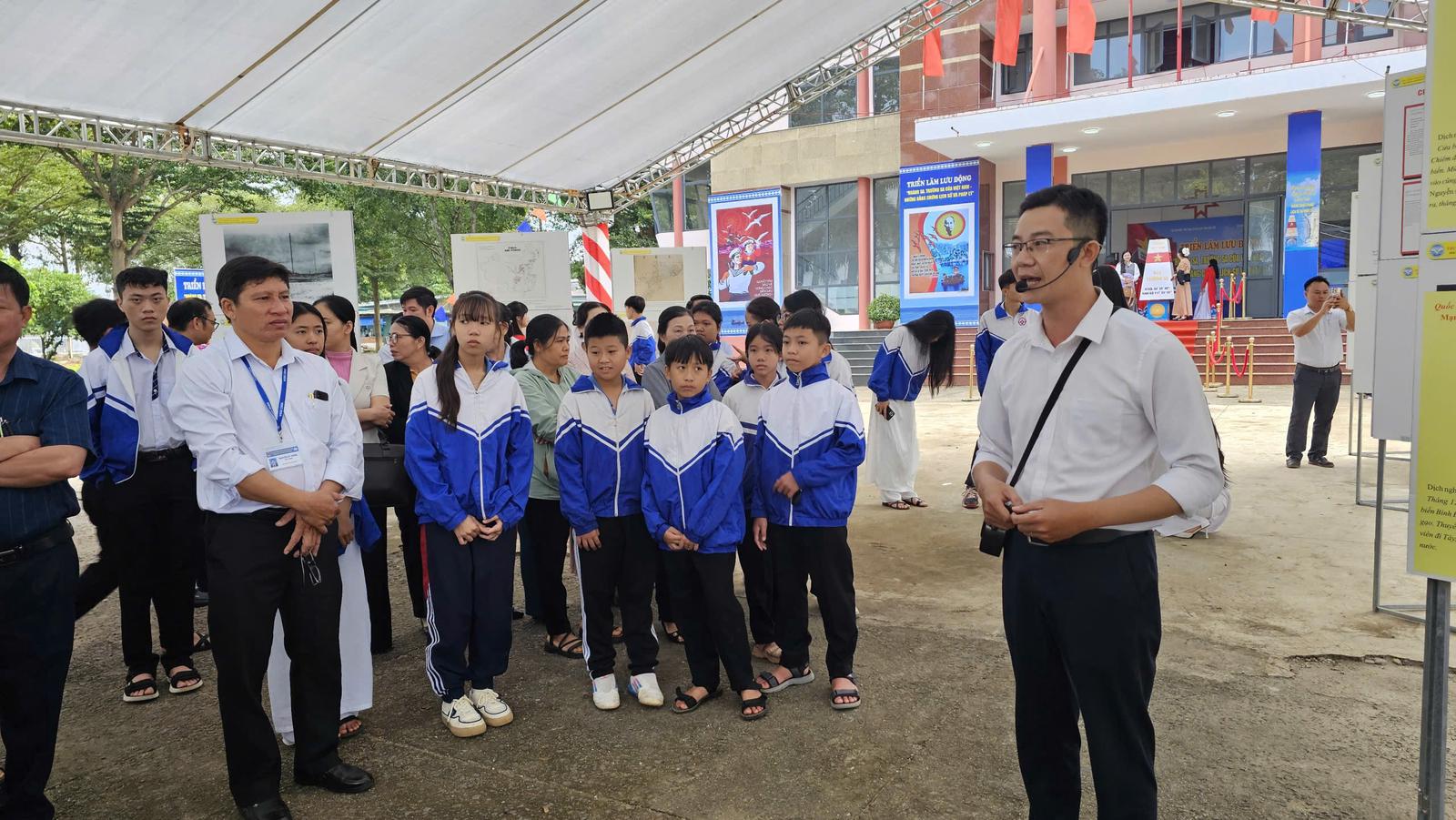 Học sinh, đoàn viên thanh niên và nhân dân địa phương chăm chú lắng nghe thuyết minh viên giới thiệu về các bằng chứng lịch sử khẳng định chủ quyền Hoàng Sa, Trường Sa. Ảnh: SVHTTDL