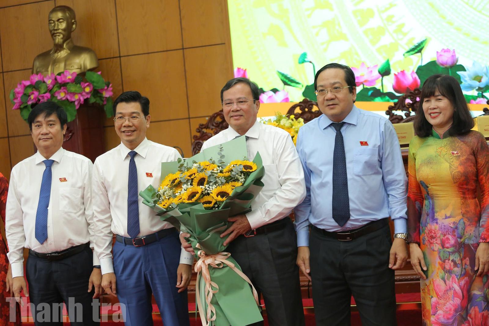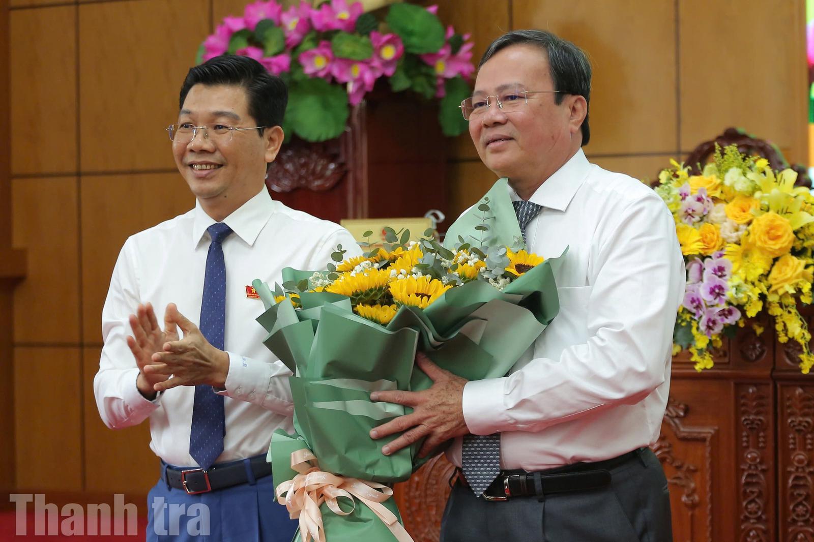 Ông Lê Văn Hẳn nhận hoa chúc mừng từ lãnh đạo HĐND tỉnh Tây Ninh. Ảnh: Thu Huyền