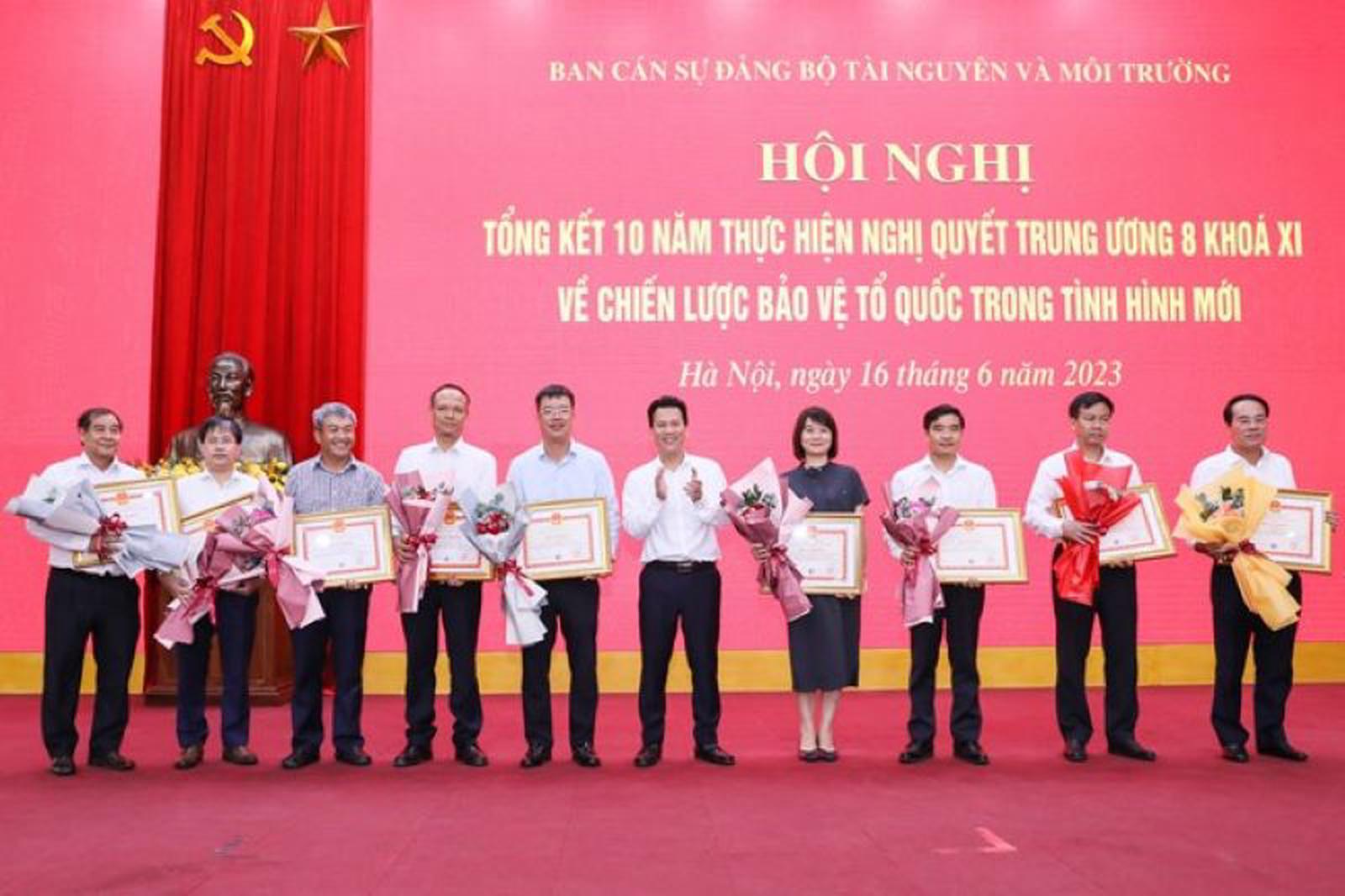Cũng tại hội nghị này, Bộ TN&MT tặng bằng khen cho các tập thể, cá nhân có thành tích xuất sắc trong thực hiện Nghị quyết Trung ương 8, khóa XI về Chiến lược Bảo vệ Tổ quốc trong tình hình mới. Ảnh: Q.V