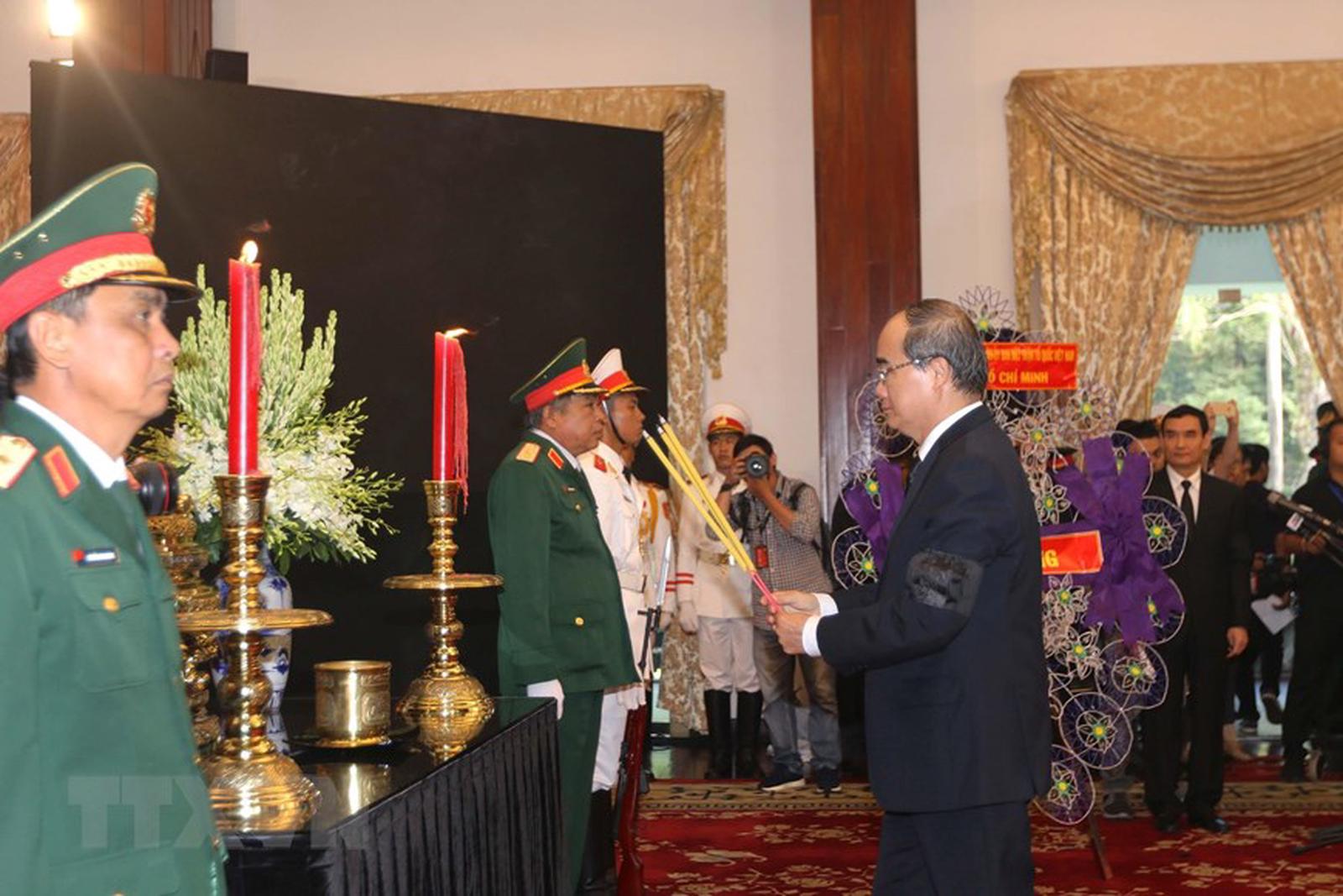 Đồng chí Nguyễn Thiện Nhân, Ủy viên Bộ Chính trị, Bí thư Thành ủy Thành phố Hồ Chí Minh, dẫn đầu đoàn đại biểu dâng hương viếng nguyên Chủ tịch nước, Đại tướng Lê Đức Anh. (Ảnh: Hoàng Anh Tuấn/TTXVN)