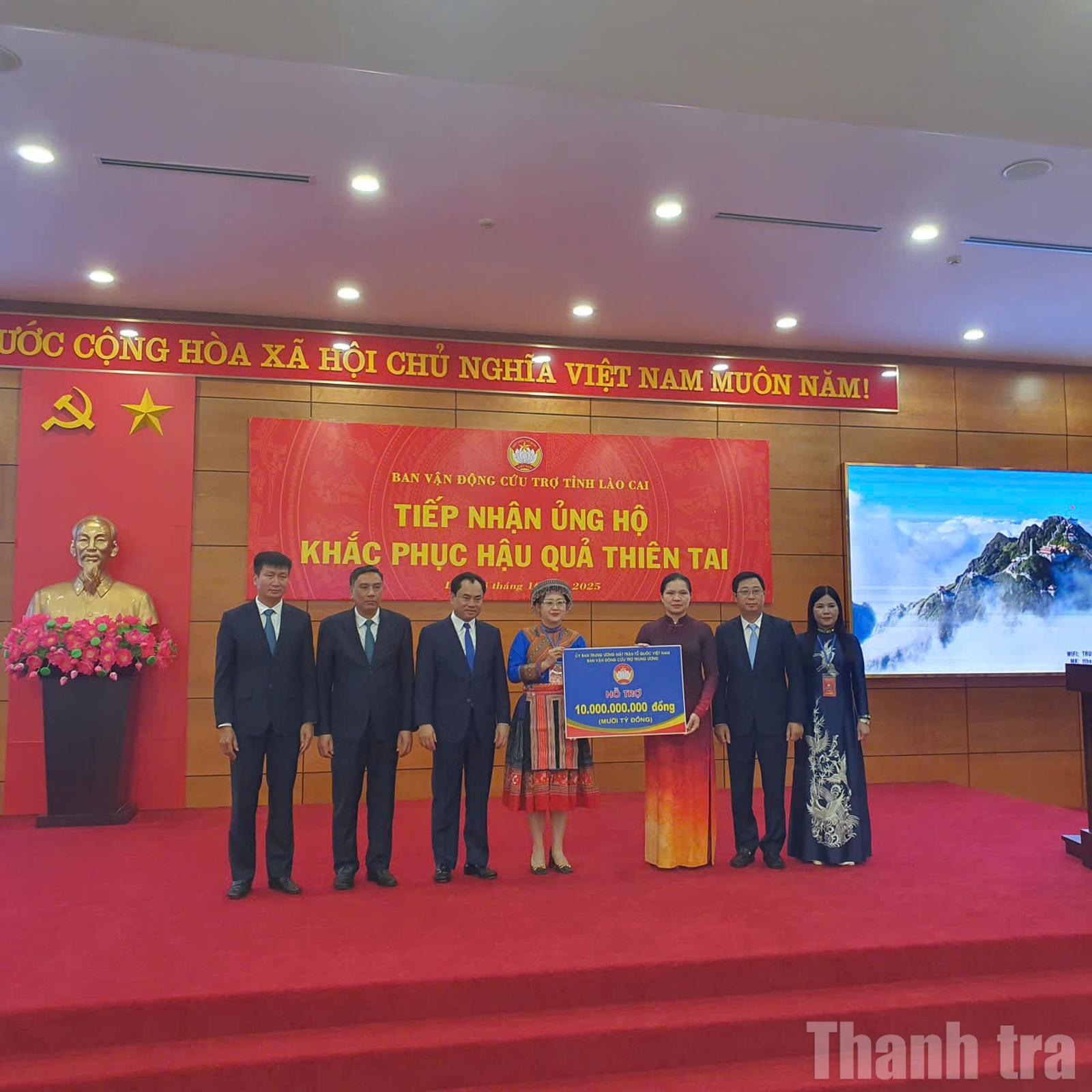 Phát biểu tại sự kiện, bà Hà Thị Nga, Phó Chủ tịch Trung ương MTTQ Việt Nam cho biết: “Đến nay, Trung ương MTTQ Việt Nam đã tiếp nhận trên 2.000 tỷ đồng hỗ trợ người dân bị ảnh hưởng bởi thiên tai. Riêng Lào Cai đã được hỗ trợ 15 tỷ đồng đợt 1 và 10 tỷ đồng đợt 2, thể hiện tình cảm tương thân tương ái của đồng bào cả nước, cộng đồng người Việt Nam ở nước ngoài hướng về nhân dân vùng bị thiên tai".