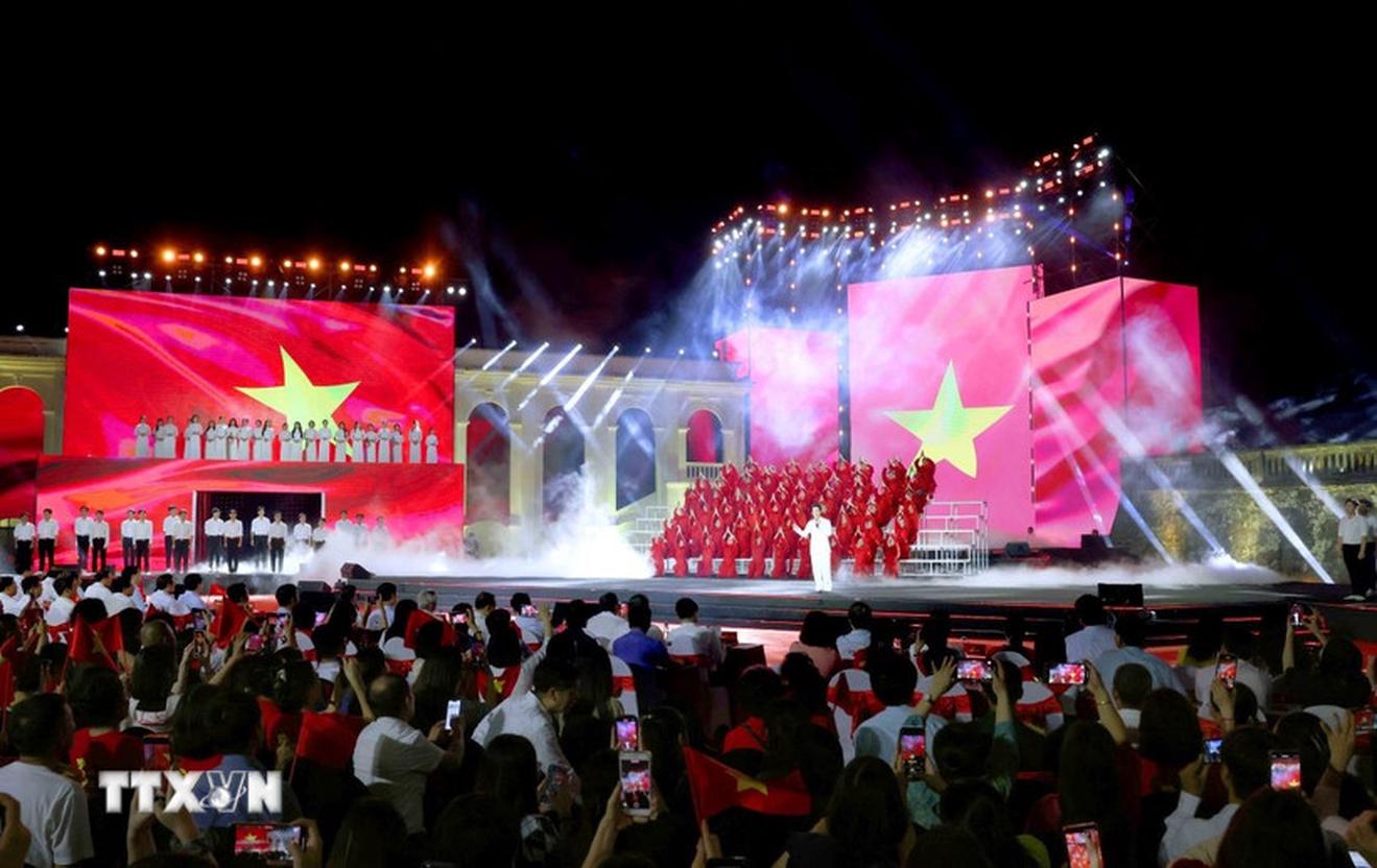Tiết mục nghệ thuật biểu diễn trong chương trình tại điểm cầu Cột cờ Hà Nội. Ảnh: Phương Hoa/TTXVN
