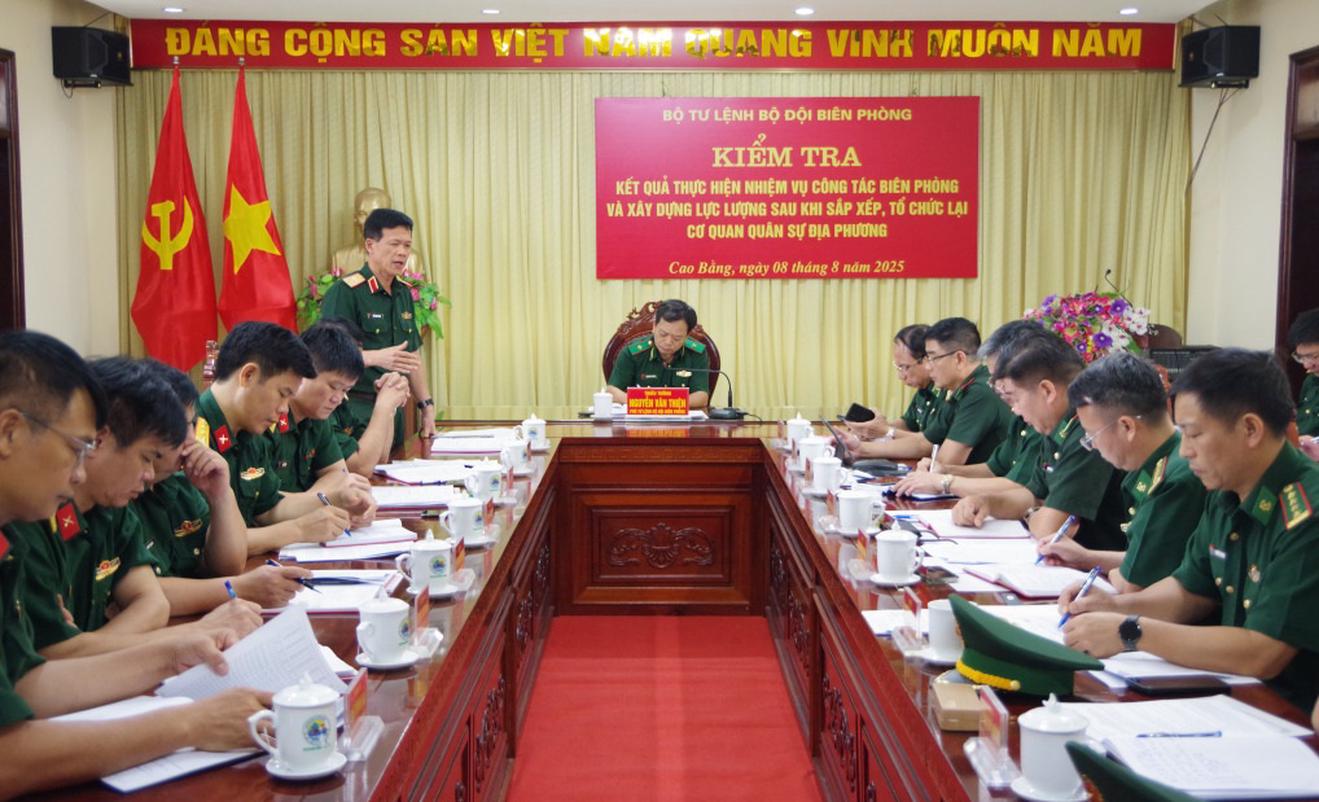 (Thanh tra) - Ngày 8/8/2025, Đoàn kiểm tra của Bộ Tư lệnh Bộ đội Biên phòng (BĐBP) phối hợp với Đoàn kiểm tra của Bộ Tư lệnh Quân khu kiểm tra tại Ban Chỉ huy BĐBP tỉnh Cao Bằng về kết quả thực hiện nhiệm vụ công tác Biên phòng và xây dựng lực lượng sau khi sắp xếp, tổ chức lại cơ quan quân sự địa phương.