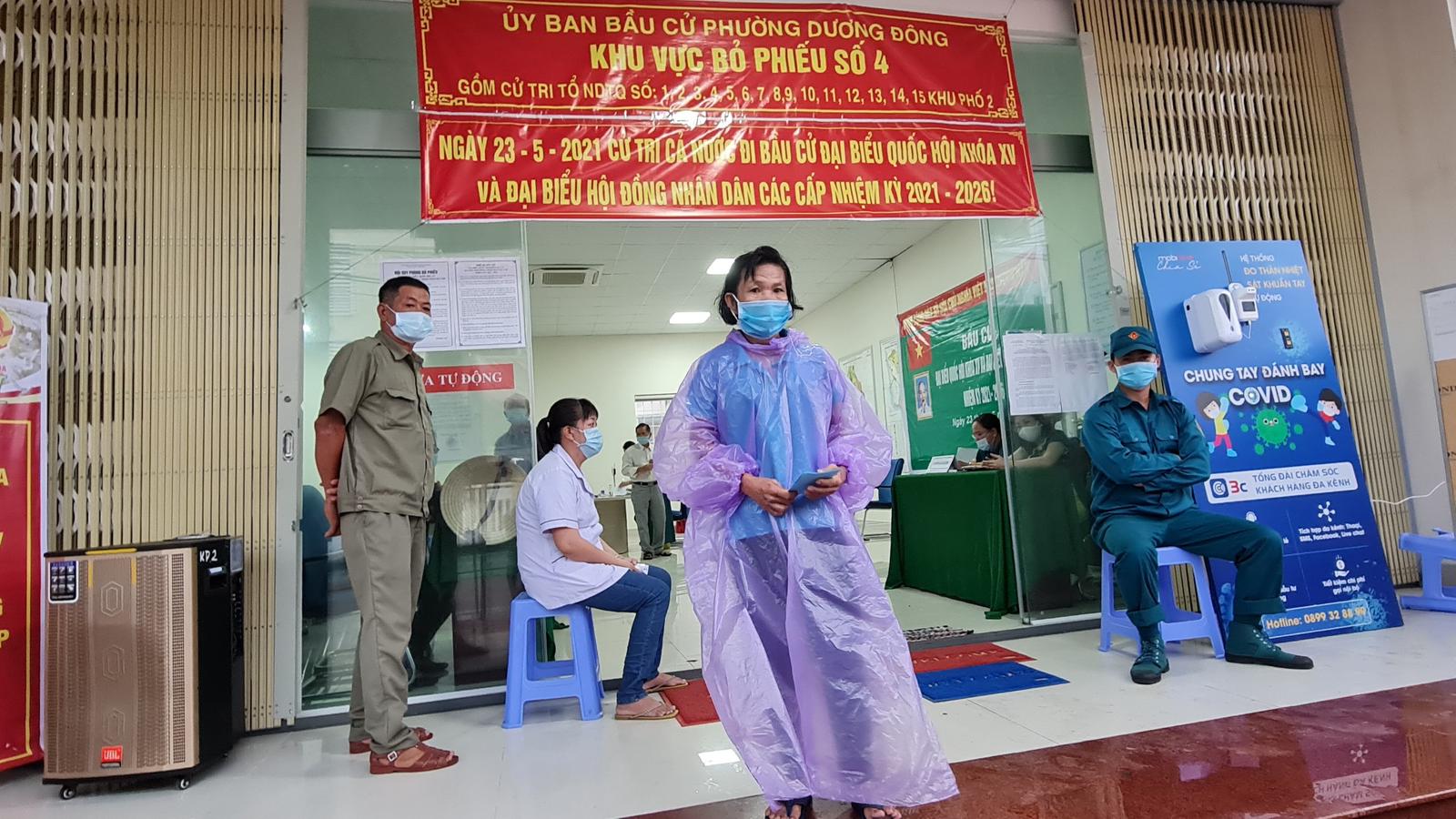 Mặc dù sáng 23/5, TP Phú Quốc mưa lớn nhưng cử tri vẫn mặc áo mưa đến địa điểm bầu cử để thực hiện bỏ phiếu bầu. Ảnh: CTV