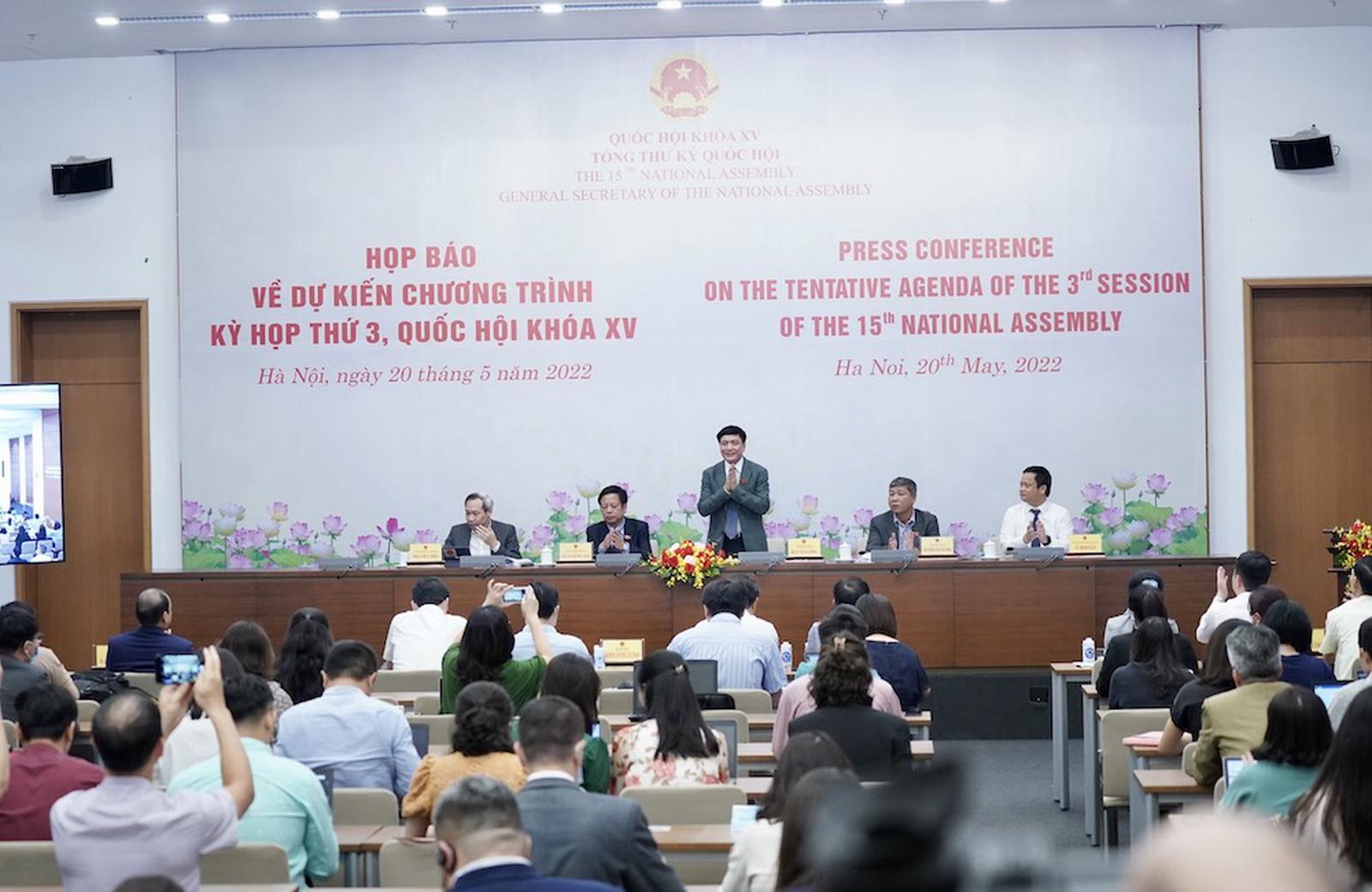 Thông tin về chương trình kỳ họp, Phó Chủ nhiệm Văn phòng Quốc hội Vũ Minh Tuấn cho biết, dự kiến Quốc hội sẽ họp tập trung trong thời gian 19 ngày (khai mạc vào ngày 23/5, bế mạc vào ngày 16/6).