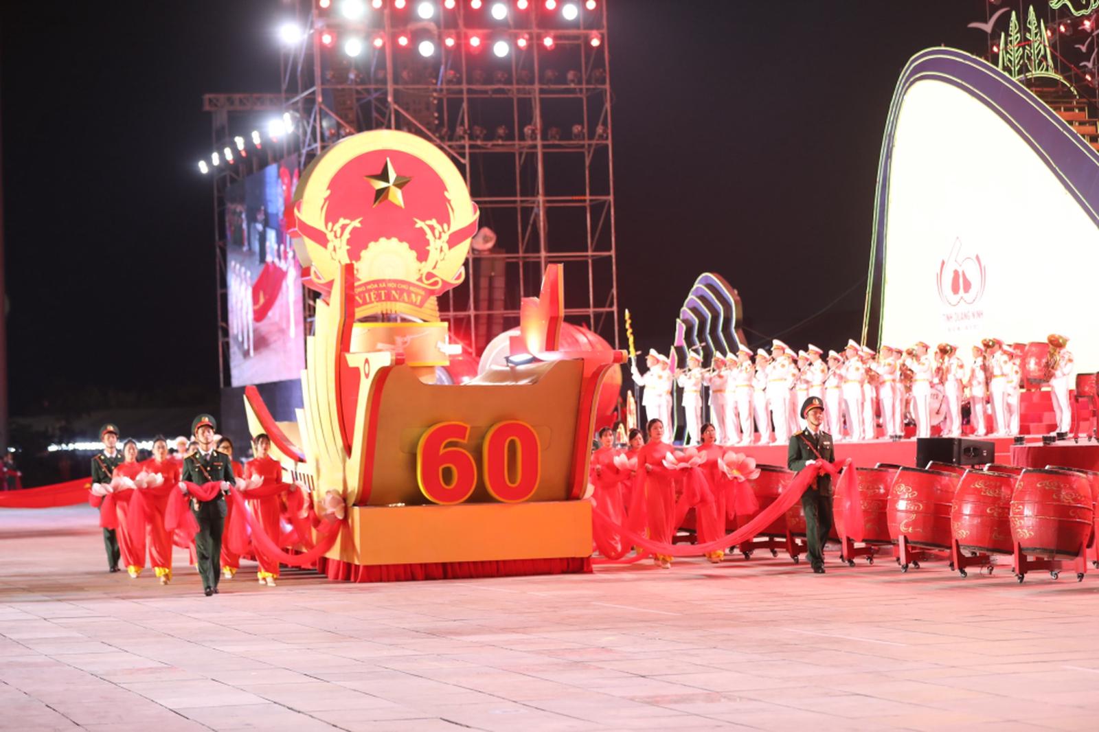 Với chủ đề “Khát vọng xây dựng một Quảng Ninh kiểu mẫu, giàu đẹp, văn minh, hiện đại", mở đầu buổi lễ là màn diễu hành hưởng ứng kỷ niệm 60 năm ngày thành lập tỉnh với gần 2.500 người tham gia thuộc 39 khối diễn thuộc các lực lượng vũ trang, công an nhân dân, các sở, ban, ngành, tổ chức, đoàn thể, lực lượng công nhân, doanh nhân, thanh niên, nhân dân các địa phương.