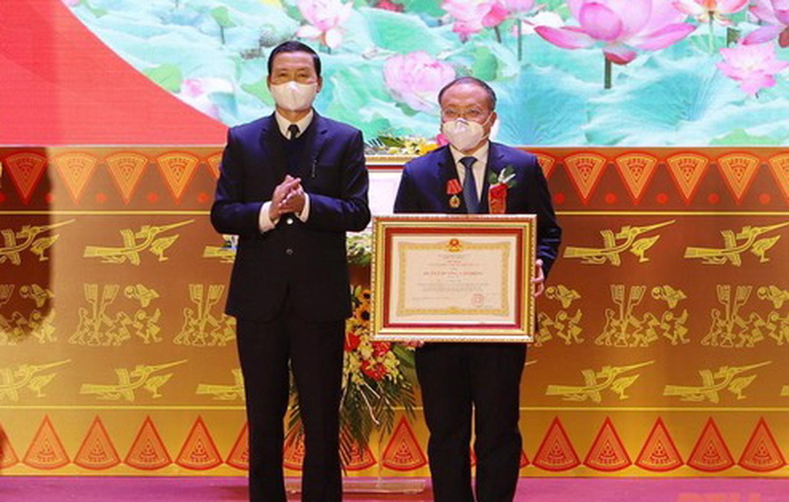 Chủ tịch UBND tỉnh Thanh Hóa Đỗ Minh Tuấn (trái ảnh) gắn và trao Huân chương Lao động hạng Ba cho đồng chí Lê Trọng Thụ, Bí thư Huyện ủy, Chủ tịch UBND huyện Đông Sơn. Ảnh: VT