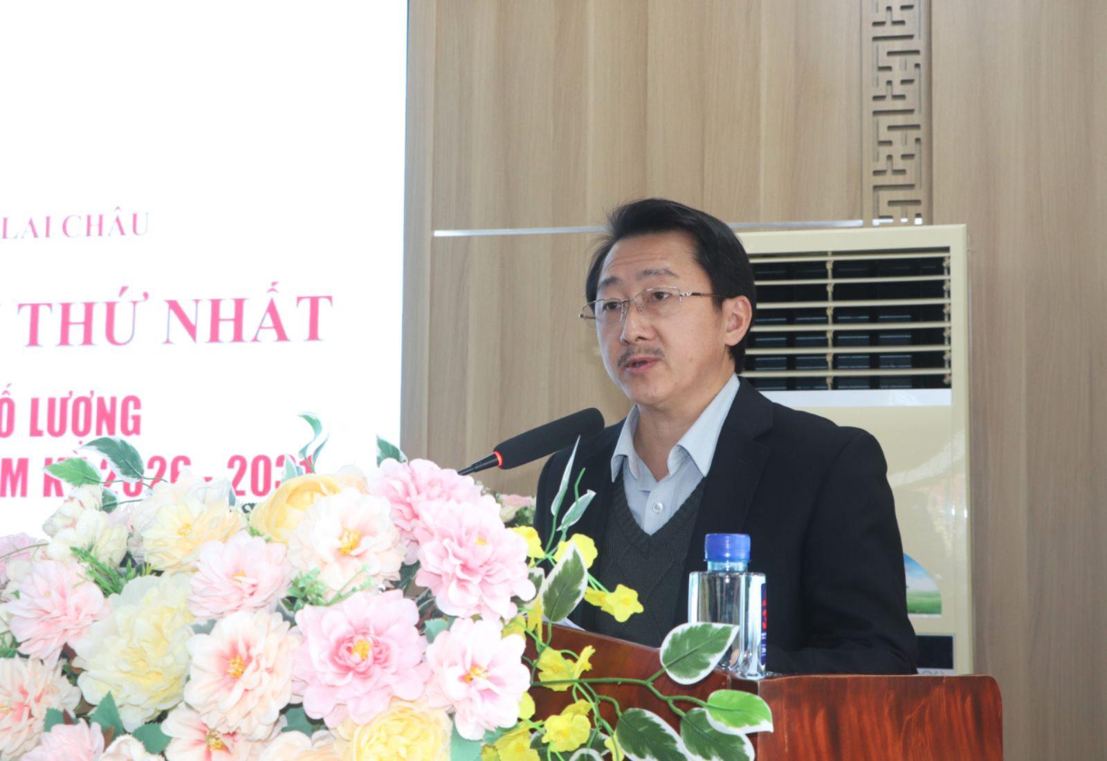 Ông Sùng A Hồ, Phó Bí thư Thường trực Tỉnh uỷ, Chủ tịch Uỷ ban MTTQ Việt Nam tỉnh Lai Châu phát biểu kết luận Hội nghị. Ảnh: Đinh Lan