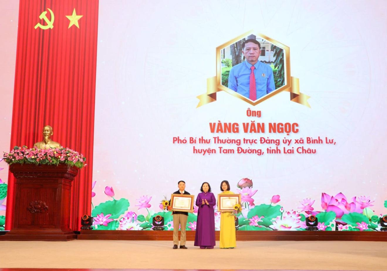 Thừa uỷ quyền của Thủ tướng Chính phủ, bà Giàng Páo Mỷ, Bí thư Tỉnh ủy trao tặng Bằng khen của Thủ tướng Chính phủ cho 2 cá nhân. Ảnh: Đinh Lan – Thu Hoài