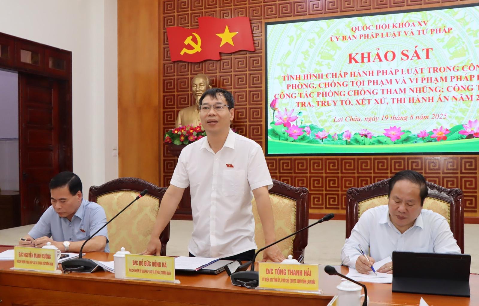 Kết luận buổi làm việc, ông Đỗ Đức Hồng Hà, Phó Chủ nhiệm Ủy ban Pháp luật và Tư pháp ghi nhận tinh thần trách nhiệm và sự chuẩn bị nghiêm túc của tỉnh Lai Châu. Ông đánh giá cao những nỗ lực, kết quả đạt được của tỉnh trong công tác phòng, chống tội phạm, tham nhũng, điều tra, truy tố, xét xử và thi hành án. Ông đề nghị UBND tỉnh tiếp tục hoàn thiện báo cáo, bổ sung số liệu và làm rõ các kiến nghị để Ủy ban Pháp luật và Tư pháp tổng hợp, báo cáo Quốc hội xem xét trong thời gian tới.