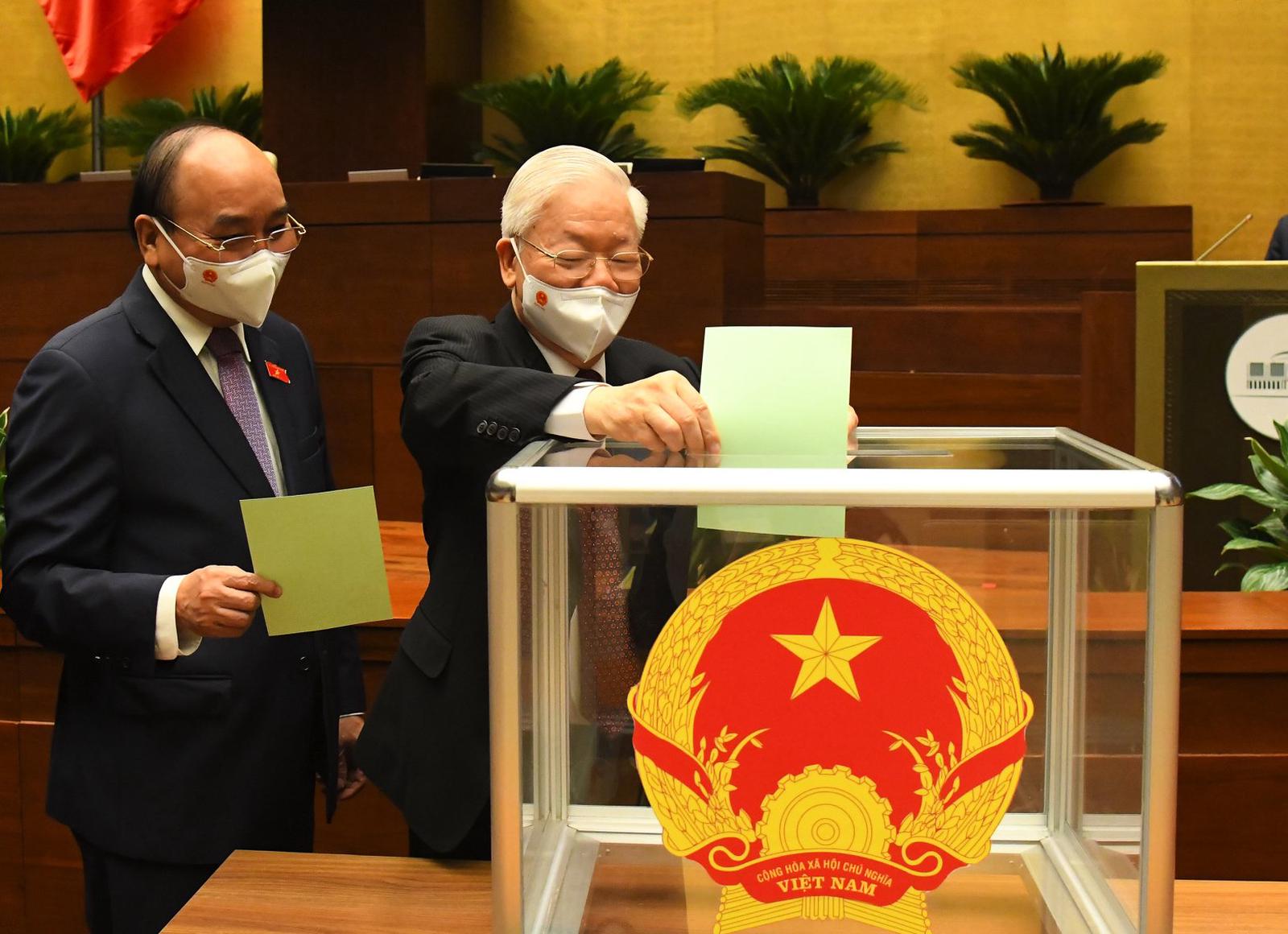 Tổng Bí thư Nguyễn Phú Trọng và Chủ tịch nước Nguyễn Xuân Phúc bỏ phiếu bầu Chủ tịch Quốc hội. Ảnh: quochoi.vn