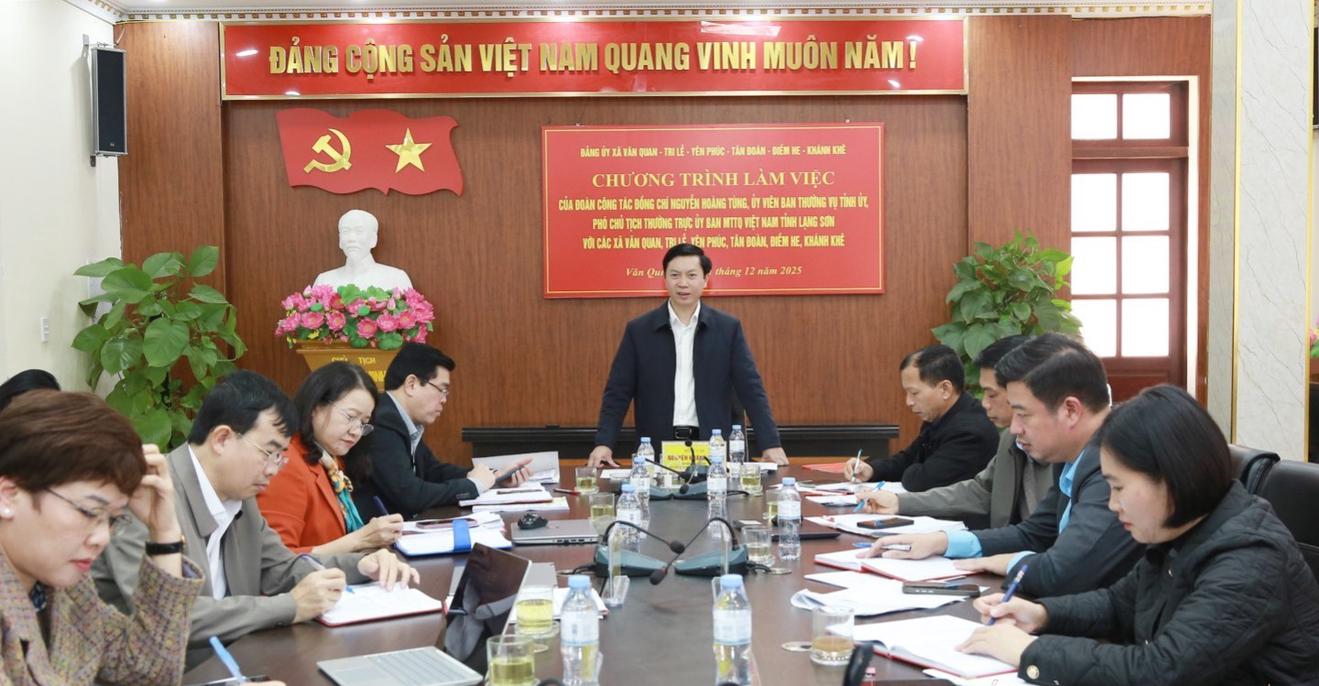 (Thanh tra) - Ngày 1/12, Tổ công tác số 8 của Ban Thường vụ Tỉnh ủy Lạng Sơn do Phó Chủ tịch Thường trực Ủy ban MTTQ Việt Nam tỉnh Nguyễn Hoàng Tùng làm tổ trưởng đã làm việc với các xã: Văn Quan, Điềm He, Yên Phúc, Tân Đoàn, Khánh Khê và Tri Lễ nhằm đánh giá công tác lãnh đạo, chỉ đạo và kết quả thực hiện nhiệm vụ từ 1/7/2025 đến nay.