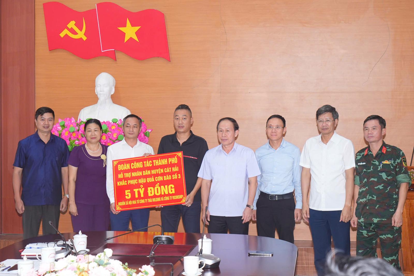 Bí thư Thành ủy Lê Tiến Châu chia sẻ với những thiệt hại mà huyện Cát Hải phải gánh chịu do ảnh hưởng của cơn bão số 3; đồng thời đánh giá huyện đã nỗ lực, tập trung lãnh đạo, chỉ đạo, huy động tối đa lực lượng, phương tiện, máy móc, thiết bị để khẩn trương khắc phục thiệt hại do bão số 3 gây ra.