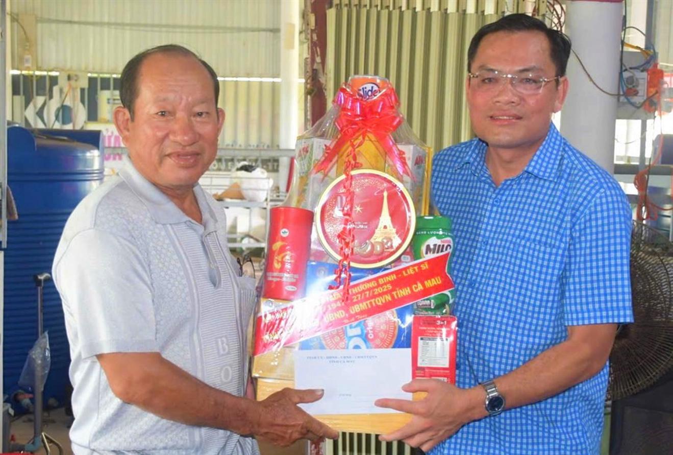 (Thanh tra) - Ngày 22/7/2025, nhân dịp kỷ niệm 78 năm ngày Thương binh - Liệt sĩ (27/7/1947 – 27/7/2025), Đoàn cán bộ của Tỉnh ủy, HĐND tỉnh, UBND tỉnh, Ủy ban MTTQ Việt Nam tỉnh Cà Mau do Phó Chủ tịch UBND tỉnh Ngô Vũ Thăng làm Trưởng đoàn đã đến thăm, tặng quà các gia đình chính sách, thương binh trên địa bàn các xã Năm Căn, Đất Mới và Tam Giang.