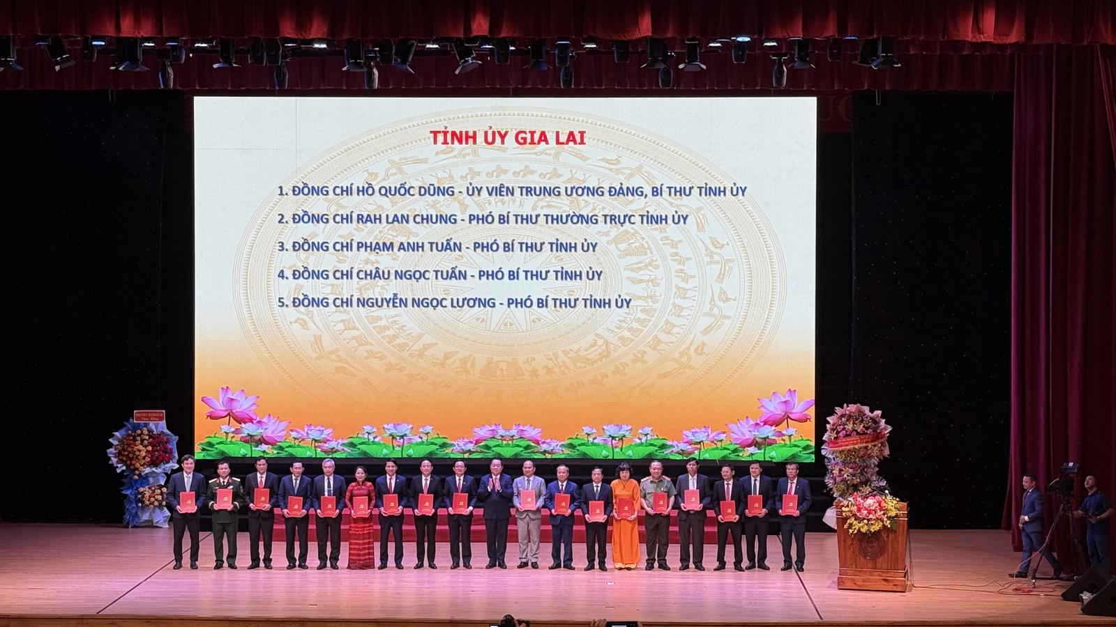 Đồng chí Nguyễn Trọng Nghĩa, Ủy viên Bộ Chính trị, Bí thư Trung ương Đảng, Trưởng Ban Tuyên giáo và Dân vận Trung ương trao các quyết định chỉ định Chủ tịch, Phó Chủ tịch UBND tỉnh Gia Lai. Ảnh: BT