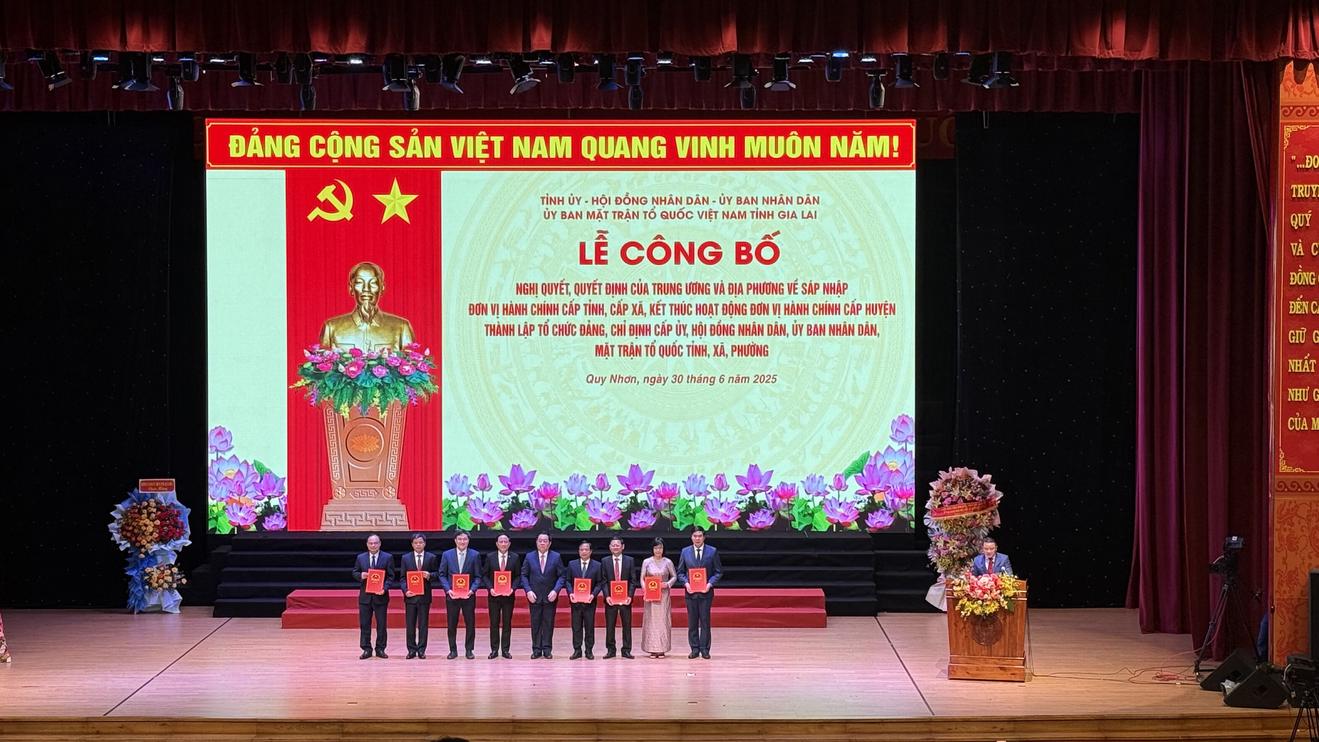 (Thanh tra) - Ngày 30/6, Tỉnh ủy, HĐND, UBND và Uỷ ban Mặt trận Tổ quốc Việt Nam tỉnh Gia Lai đã long trọng tổ chức Lễ công bố các nghị quyết, quyết định của Trung ương và địa phương liên quan đến việc sáp nhập đơn vị hành chính cấp tỉnh, cấp xã, kết thúc hoạt động đơn vị hành chính cấp huyện và thành lập tổ chức Đảng, chỉ định cấp ủy, HĐND, UBND, Ủy ban Mặt trận Tổ quốc các cấp tại tỉnh Gia Lai, trong đó có xã, phường Bình Định thuộc địa bàn sắp xếp.