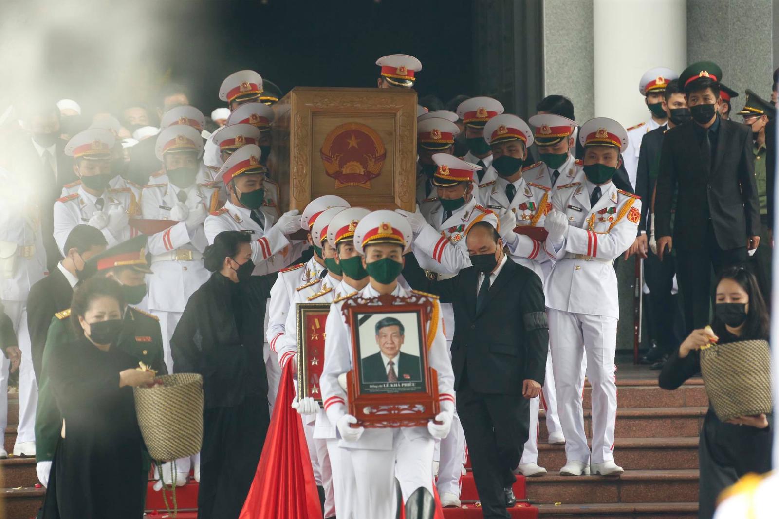Linh xa di chuyển từ đại sảnh Nhà Tang lễ quốc gia ra phía cổng. Lãnh đạo, nguyên lãnh đạo Đảng, Nhà nước đi theo linh xa bày tỏ sự tiếc thương đối với nguyên Tổng Bí thư Lê Khả Phiêu.
