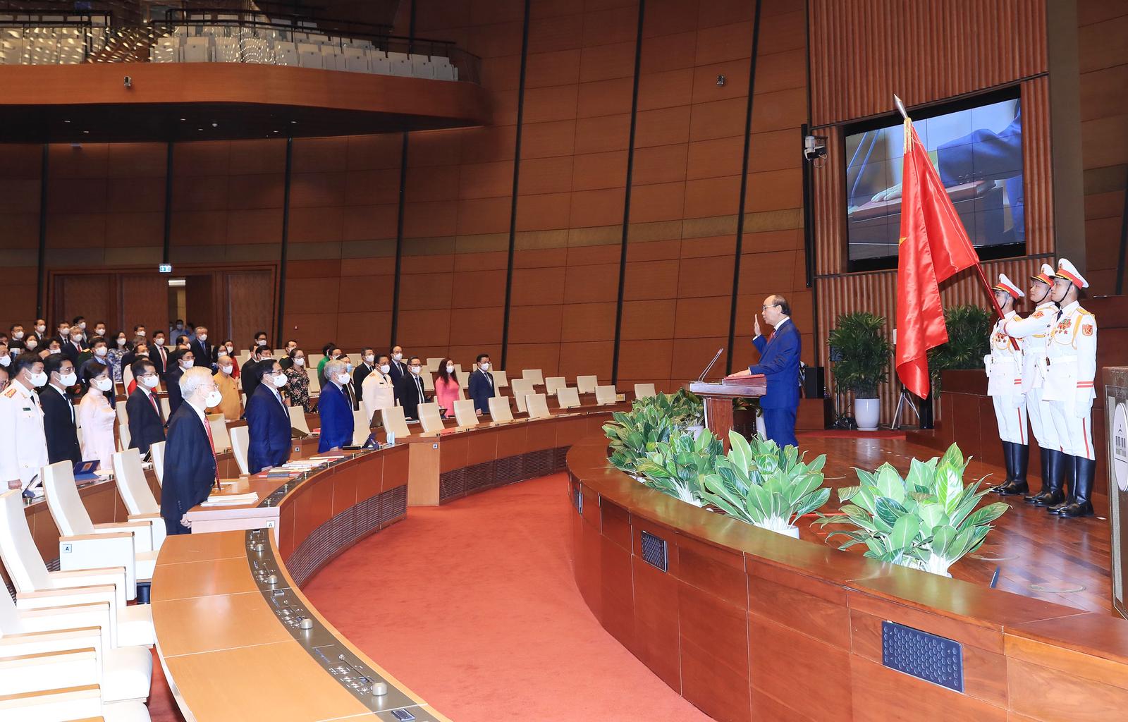 Dưới cờ đỏ sao vàng, Chủ tịch nước hứa trước Quốc hội và đồng bào sẽ luôn tu dưỡng đạo đức, cần kiệm liêm chính, chí công vô tư, thượng tôn pháp luật và tuyệt đối tuân thủ Hiến pháp, thực hiện trọn vẹn đầy đủ mọi nhiệm vụ, quyền hạn của Chủ tịch nước.