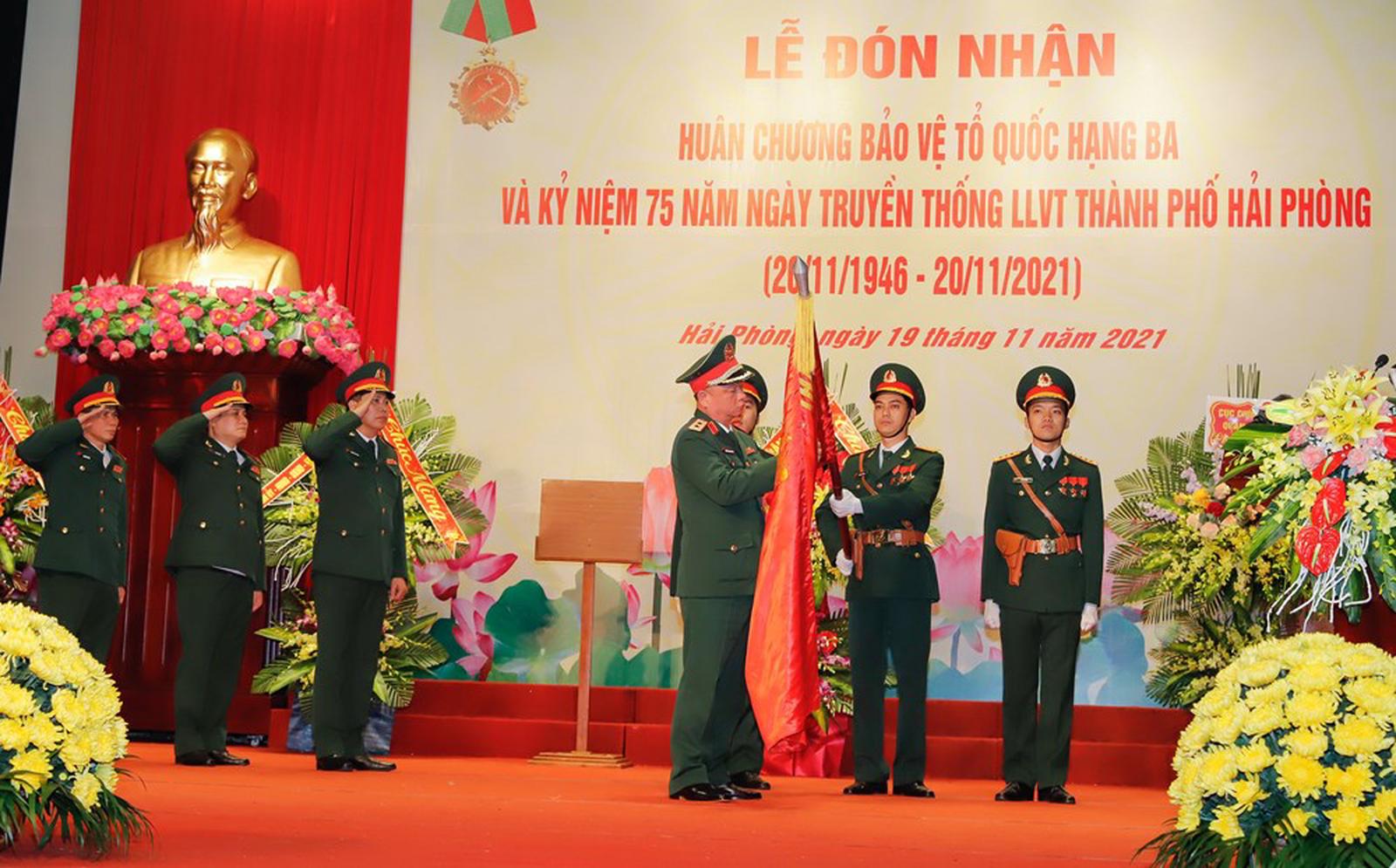 (Thanh tra) - Ngày 19/11, Thành ủy, HĐND, UBND, Ủy ban MTTQ Việt Nam thành phố Hải Phòng long trọng tổ chức đón nhận Huân chương Bảo vệ Tổ quốc hạng Ba và Kỷ niệm 75 năm Ngày truyền thống lực lượng vũ trang thành phố (20/11/2046 - 20/11/2021).
