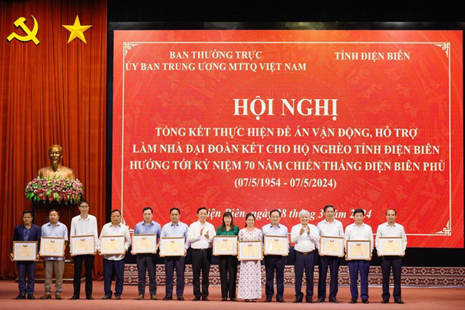 Chủ tịch MTTQ Việt Nam Đỗ Văn Chiến và Phó Thủ tướng Chính phủ Trần Hồng Hà trao Bằng khen cho các cá nhân có thành tích xuất sắc trong triển khai thực hiện Đề án vận động, hỗ trợ làm nhà đại đoàn kết cho hộ nghèo tỉnh Điện Biên, ngày 28/3/2024. Ảnh: Q.Vinh