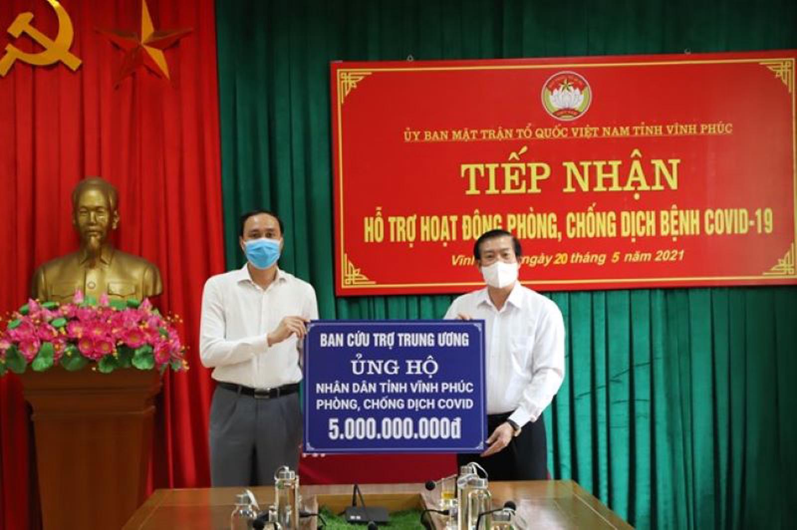 Tại Vĩnh Phúc, Phó Chủ tịch UBTƯ MTTQ Việt Nam Phùng Khánh Tài đã trao số tiền 5 tỷ đồng hỗ trợ nhân dân tỉnh phòng chống dịch Covid-19.