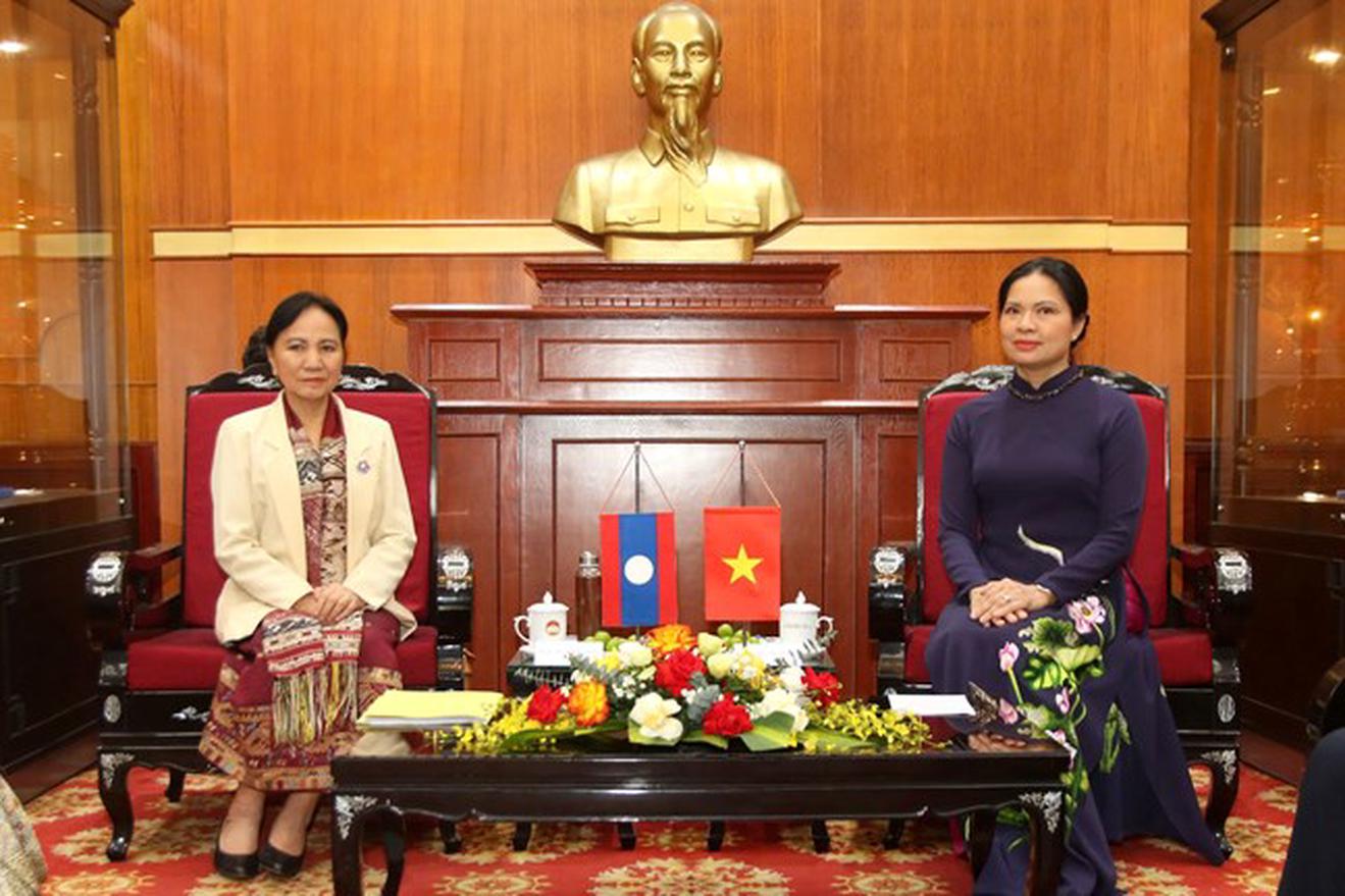 Bà Hà Thị Nga, Ủy viên Trung ương Đảng, Phó Chủ tịch Ủy ban Trung ương MTTQ Việt Nam và bà In-la-văn Keo-bun-phăn, Ủy viên Trung ương Đảng, Phó Chủ tịch Thường trực Ủy ban Trung ương Mặt trận Lào Xây dựng đất nước. Ảnh: Hương Diệp