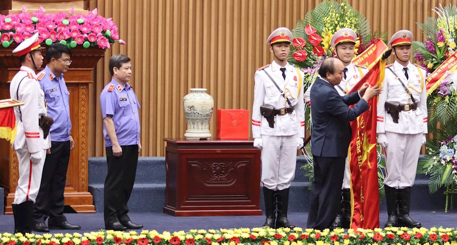 Thú tướng Nguyễn Xuân Phúc thay mặt lãnh đạo Đảng, Nhà nước gắn Huân chương Hồ Chí Minh lên lá cờ truyền thống của ngành KSND. Ảnh: PV
