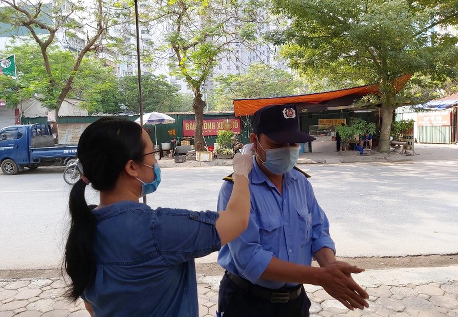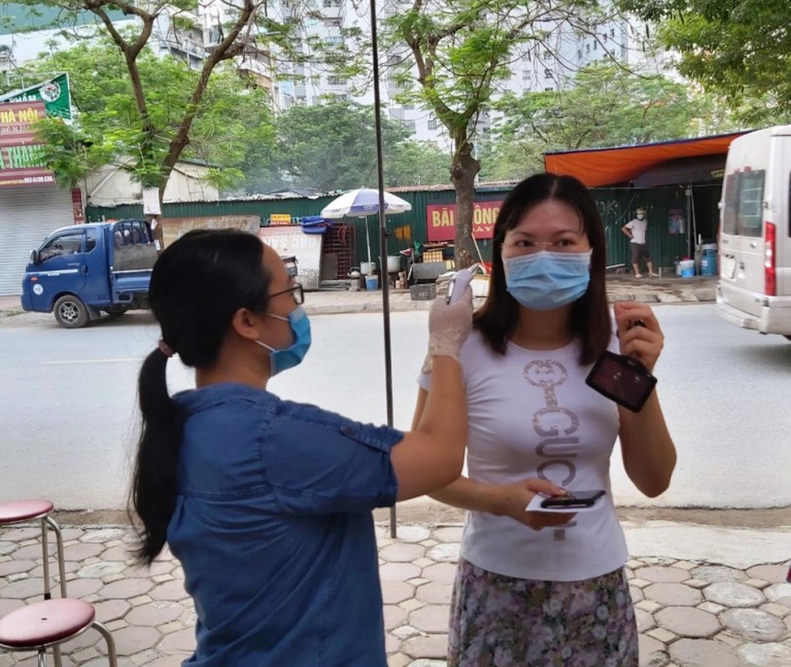 Cử tri đi đến điểm bầu cử số 14 xã Tân Triều, huyện Thanh Trì đều được sát khuẩn tay, đo thân nhiệt... để phòng Covid-19. Ảnh: HH