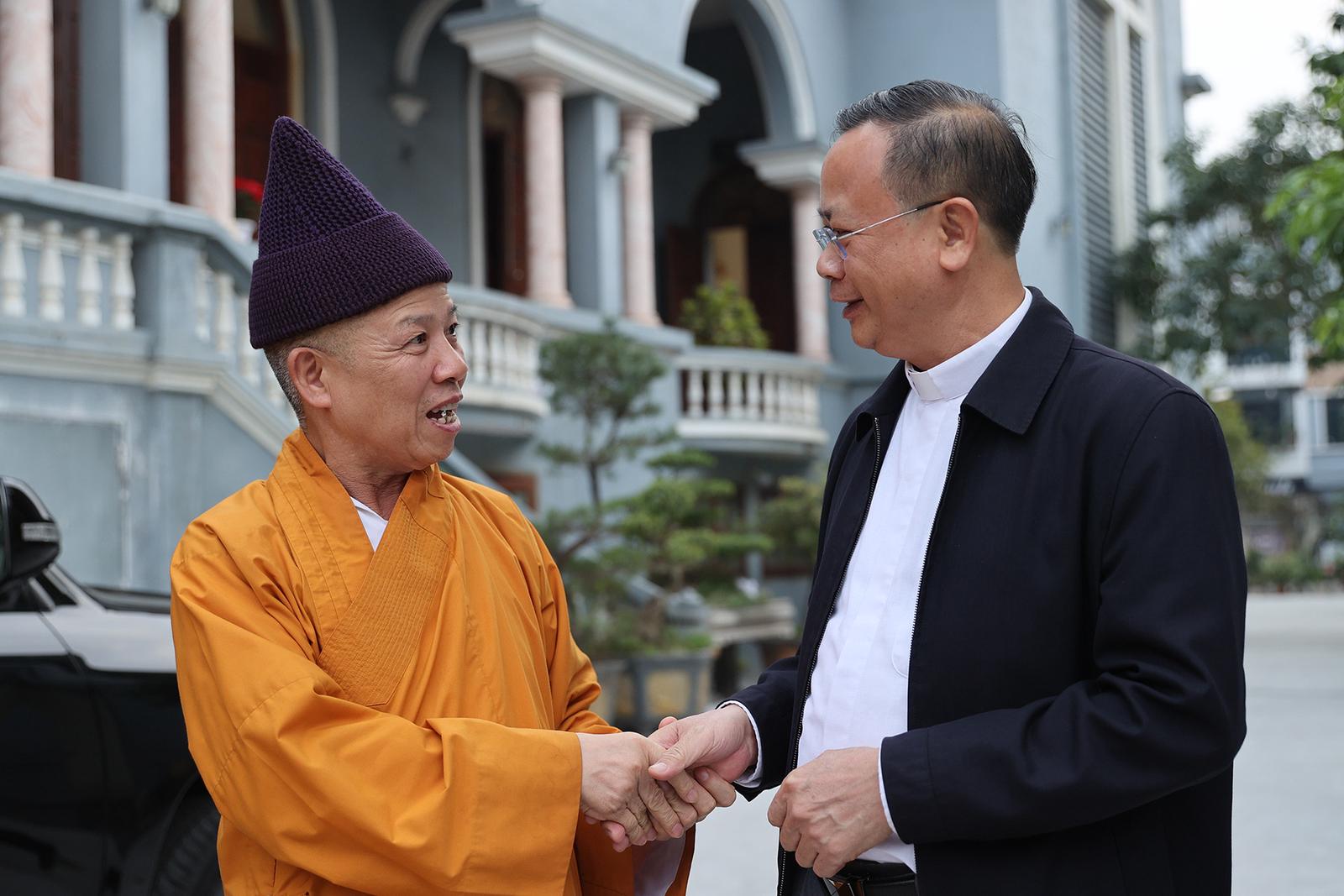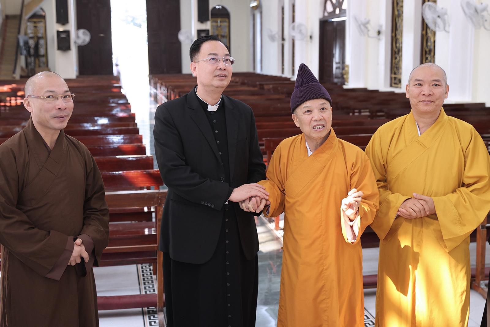 Đến hai nhà thờ, trong những cái nắm tay thật chặt giữa những nhà sư và các cha xứ, các nhà tu hành trò chuyện về đoàn kết các tôn giáo. Những năm qua, hai bên giáo hội ở hai tỉnh này không chỉ duy trì nếp thăm hỏi chúc mừng nhau vào những ngày lễ lớn của mỗi bên như ngày Phật đản của Phật giáo và ngày Giáng sinh của Công giáo. Ảnh: TV
