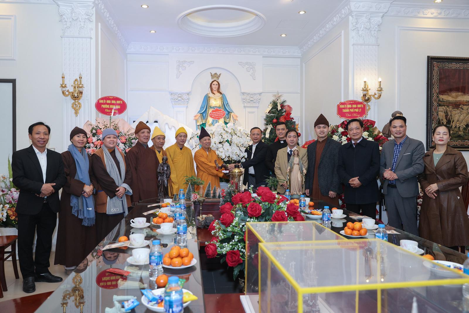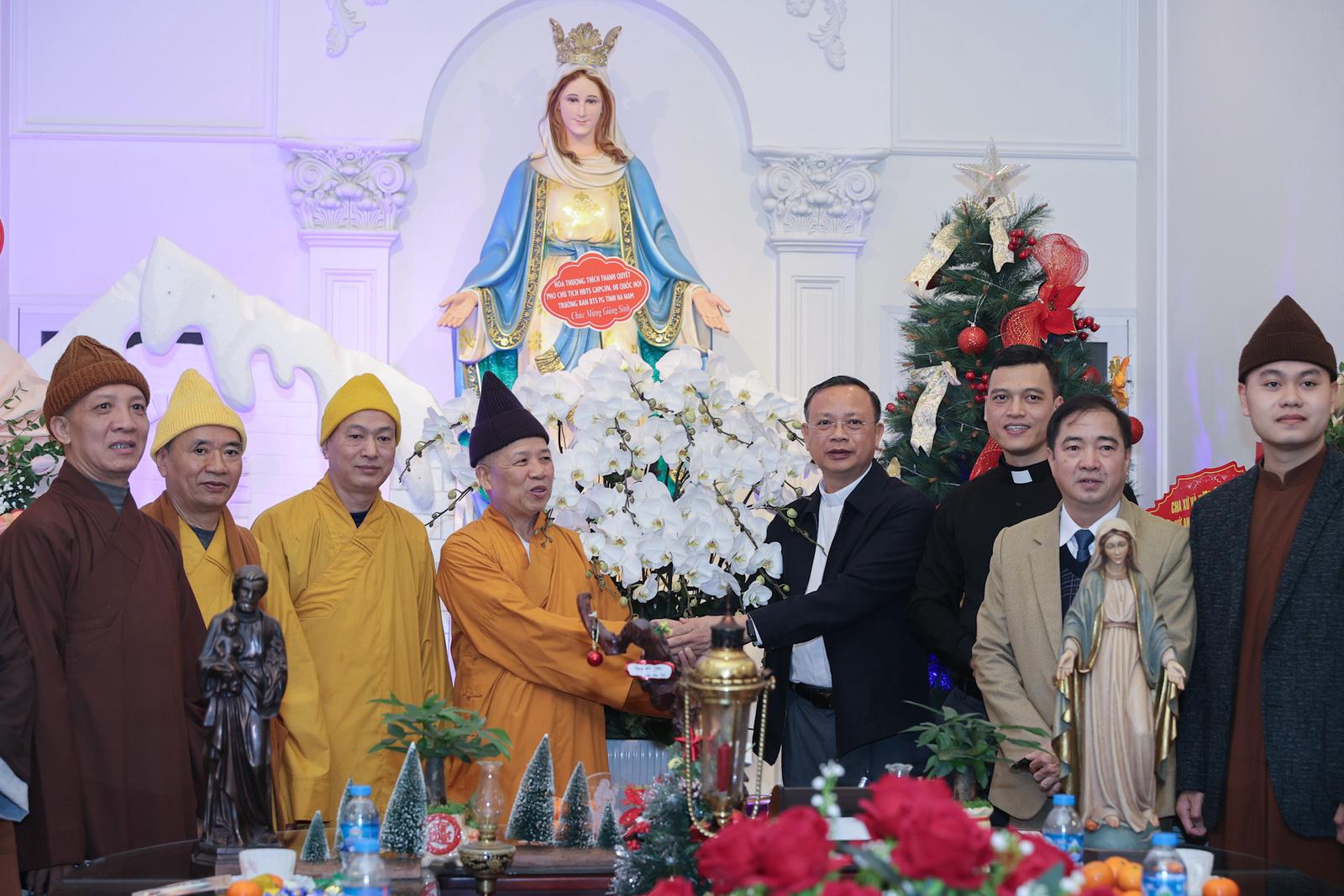 Tại Giáo xứ Phủ Lý, Hoà thượng Thích Thanh Quyết gửi lời chúc mừng Giáng sinh an lành, hạnh phúc đến Linh mục Bùi Quang Tào và các chức sắc, chức việc, cùng bà con giáo dân. Hoà thượng cho rằng, những năm qua, đồng bào các tôn giáo trên địa bàn tỉnh nói chung, thành phố Phủ Lý nói riêng đã thực hiện "Sống tốt đời, đẹp đạo", đoàn kết lương giáo, đóng góp tích cực trong việc củng cố khối đại đoàn kết toàn dân tộc; thực hiện tốt các chủ trương của Đảng, chính sách, pháp luật của Nhà nước, tích cực tham gia các phong trào thi đua của địa phương. Ảnh: TV