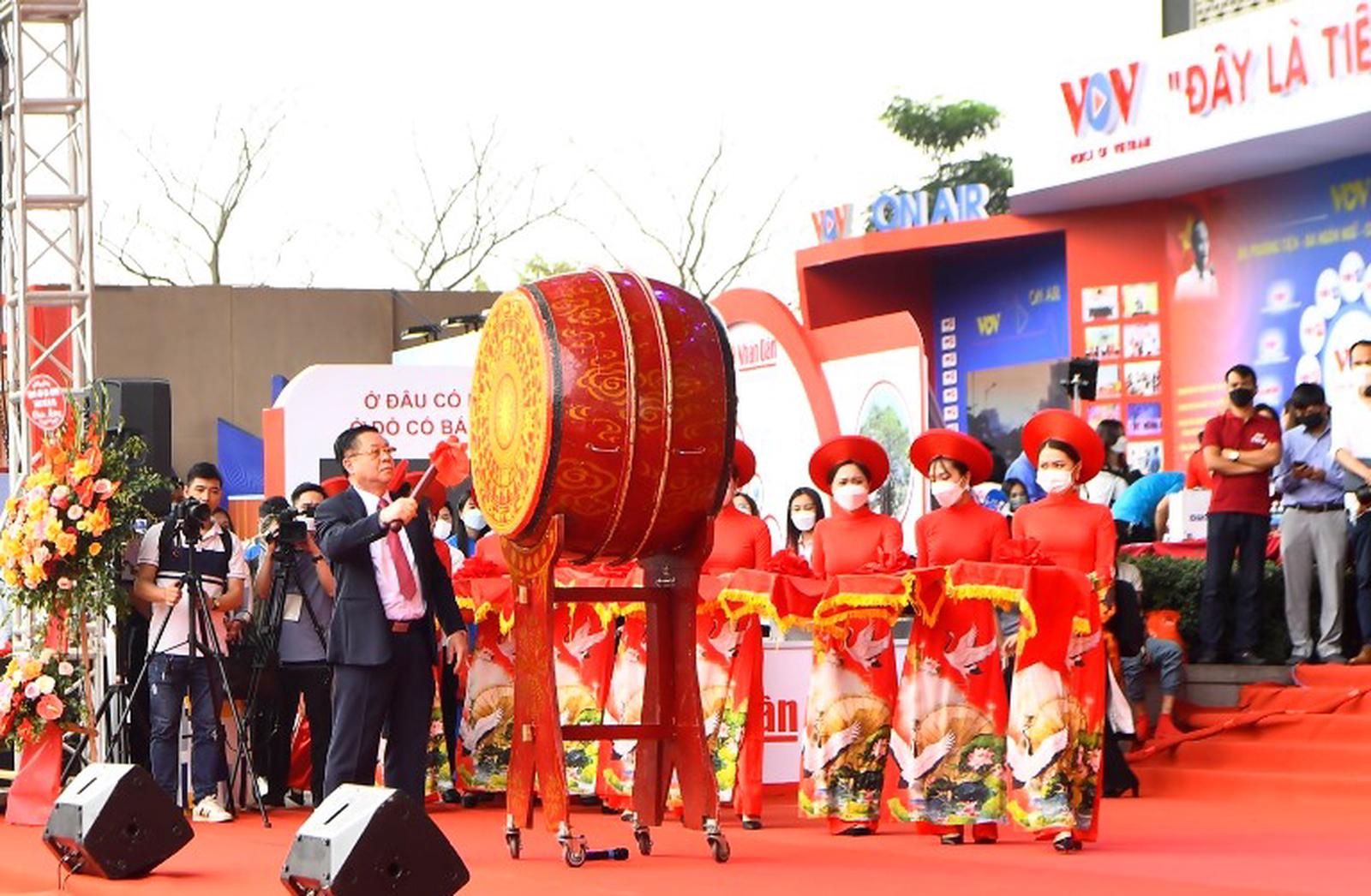 Trưởng Ban Tuyên giáo Trung ương Nguyễn Trọng Nghĩa đánh trống tại lễ khai mạc Hội báo Toàn quốc 2022. Ảnh: HH