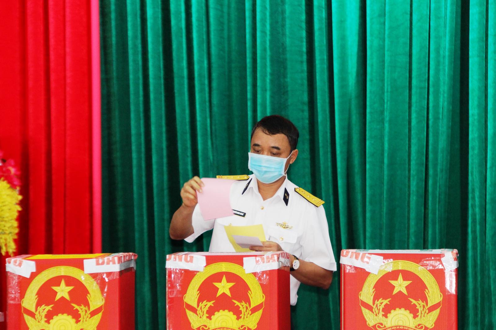 Thượng tá Nguyễn Đình Giảng, Lữ đoàn trưởng Lữ đoàn 171 Vùng 2 Hải quân bỏ lá phiếu đầu tiên. Ảnh: Mai Thắng