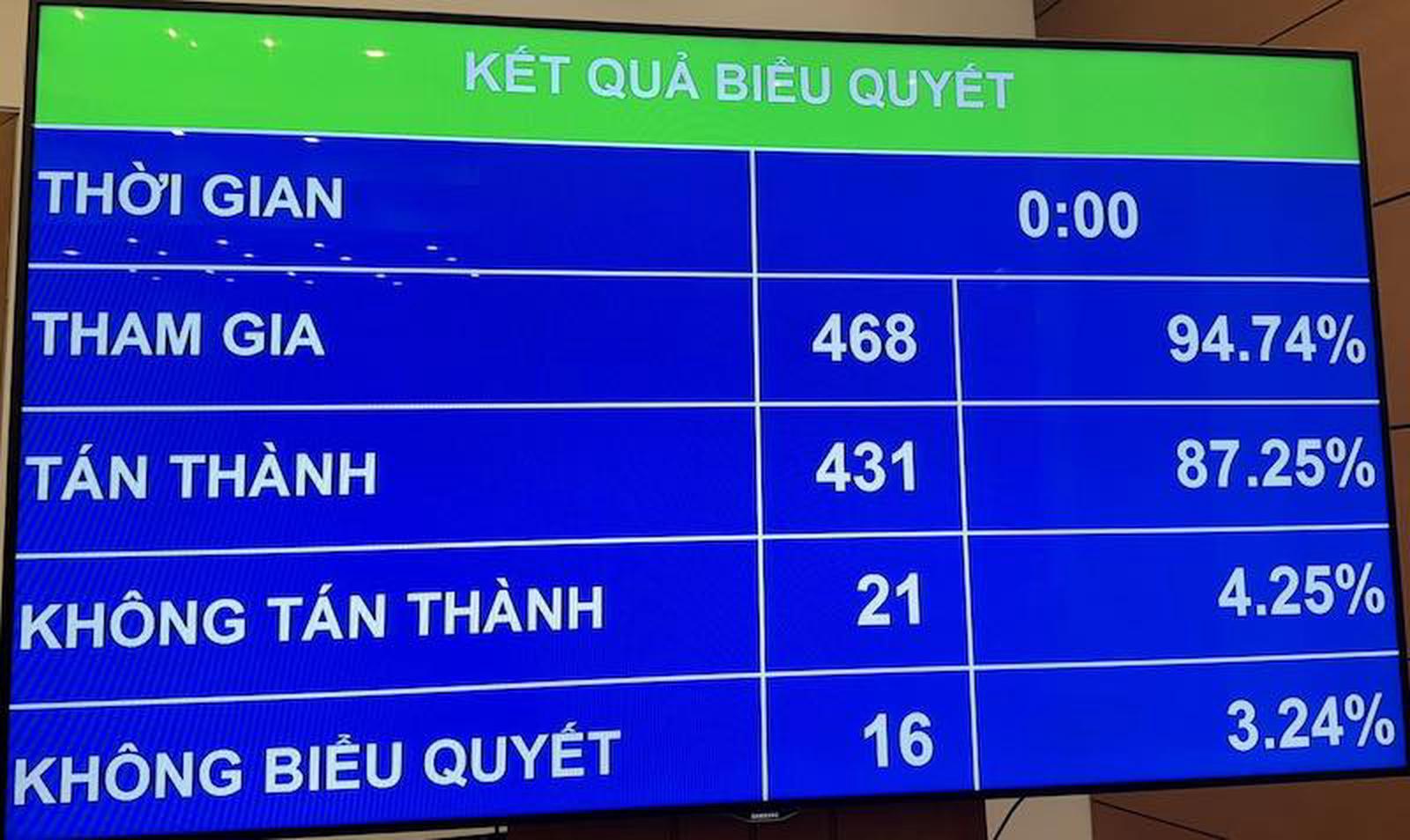 Với 431/468 đại biểu Quốc hội tham gia biểu quyết tán thành (chiếm 87,25% tổng số đại biểu), Quốc hội thông qua Luật Căn cước. Ảnh: H.G