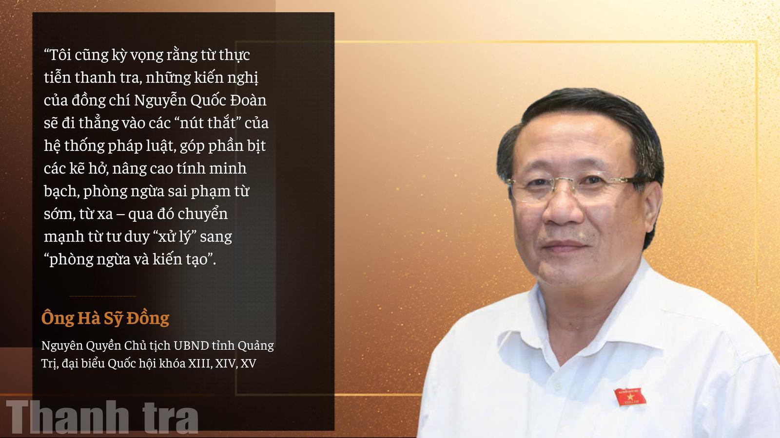 Trong bối cảnh minh bạch trở thành yêu cầu bắt buộc, theo ông Hà Sỹ Đồng, mỗi đại biểu không chỉ phát biểu mà còn phải theo đuổi vấn đề đến kết quả cuối cùng, có thể kiểm chứng và đo đếm được. "Đối với đồng chí Nguyễn Quốc Đoàn, kỳ vọng không chỉ dừng ở năng lực cá nhân, mà là khả năng chuyển hóa tiếng nói nghị trường thành hành động cải cách, góp phần giải quyết những điểm nghẽn của hệ thống", ông Đồng nhấn mạnh.