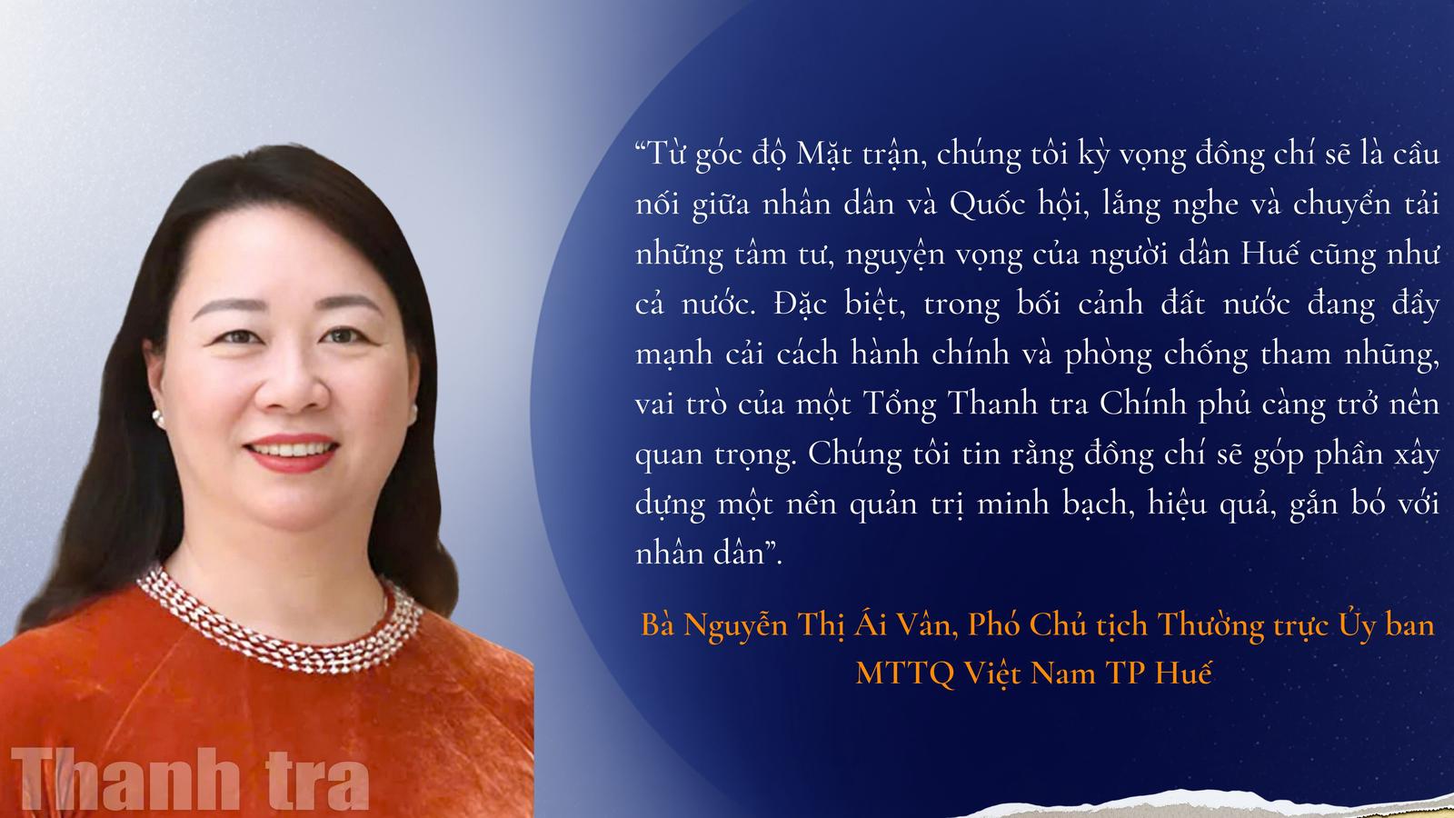 Chúng tôi kỳ vọng đồng chí sẽ là cầu nối giữa Nhân dân và Quốc hội, lắng nghe và chuyển tải những tâm tư, nguyện vọng của người dân Huế cũng như cả nước. Đặc biệt, trong bối cảnh đất nước đang đẩy mạnh cải cách hành chính và phòng, chống tham nhũng, vai trò của Tổng Thanh tra Chính phủ càng trở nên quan trọng. Chúng tôi tin rằng, đồng chí sẽ góp phần xây dựng một nền quản trị minh bạch, hiệu quả, gắn bó với Nhân dân.