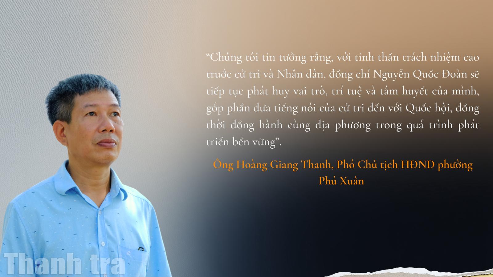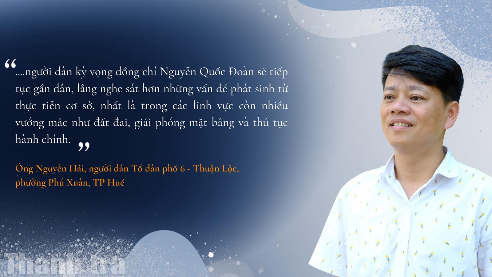 Ông Nguyễn Hải, người dân Tổ dân phố 6, Thuận Lộc, phường Phú Xuân, TP Huế bày tỏ sự quan tâm khi địa phương là nơi đồng chí Nguyễn Quốc Đoàn ứng cử và trúng cử đại biểu Quốc hội khóa XVI với tỷ lệ phiếu cao. Từ đó, người dân kỳ vọng đồng chí sẽ tiếp tục gần dân, lắng nghe sát hơn những vấn đề phát sinh từ thực tiễn cơ sở, nhất là trong các lĩnh vực còn nhiều vướng mắc như đất đai, giải phóng mặt bằng và thủ tục hành chính.