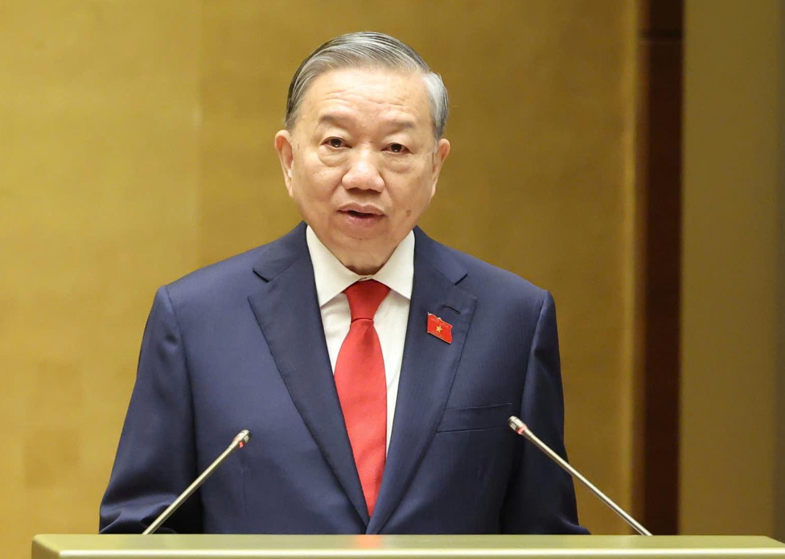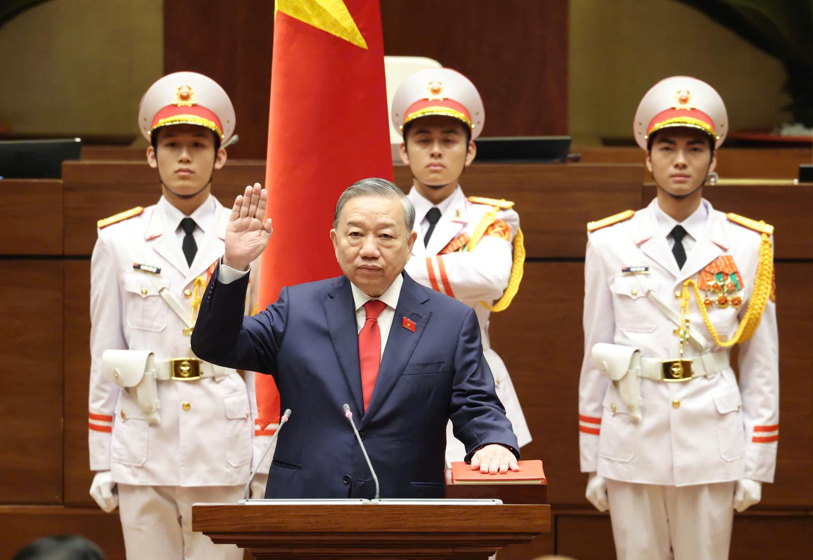 "Dưới cờ đỏ sao vàng thiêng liêng của Tổ quốc, trước Quốc hội, đồng bào và cử tri, tôi, Chủ tịch nước Cộng hòa Xã hội Chủ nghĩa Việt Nam xin tuyên thệ: Tuyệt đối trung thành với Tổ quốc, với Nhân dân, với Hiến pháp nước Cộng hòa Xã hội Chủ nghĩa Việt Nam, nỗ lực phấn đấu, hoàn thành tốt mọi nhiệm vụ mà Đảng, Nhà nước và Nhân dân giao phó", tân Chủ tịch nước Tô Lâm tuyên thệ.