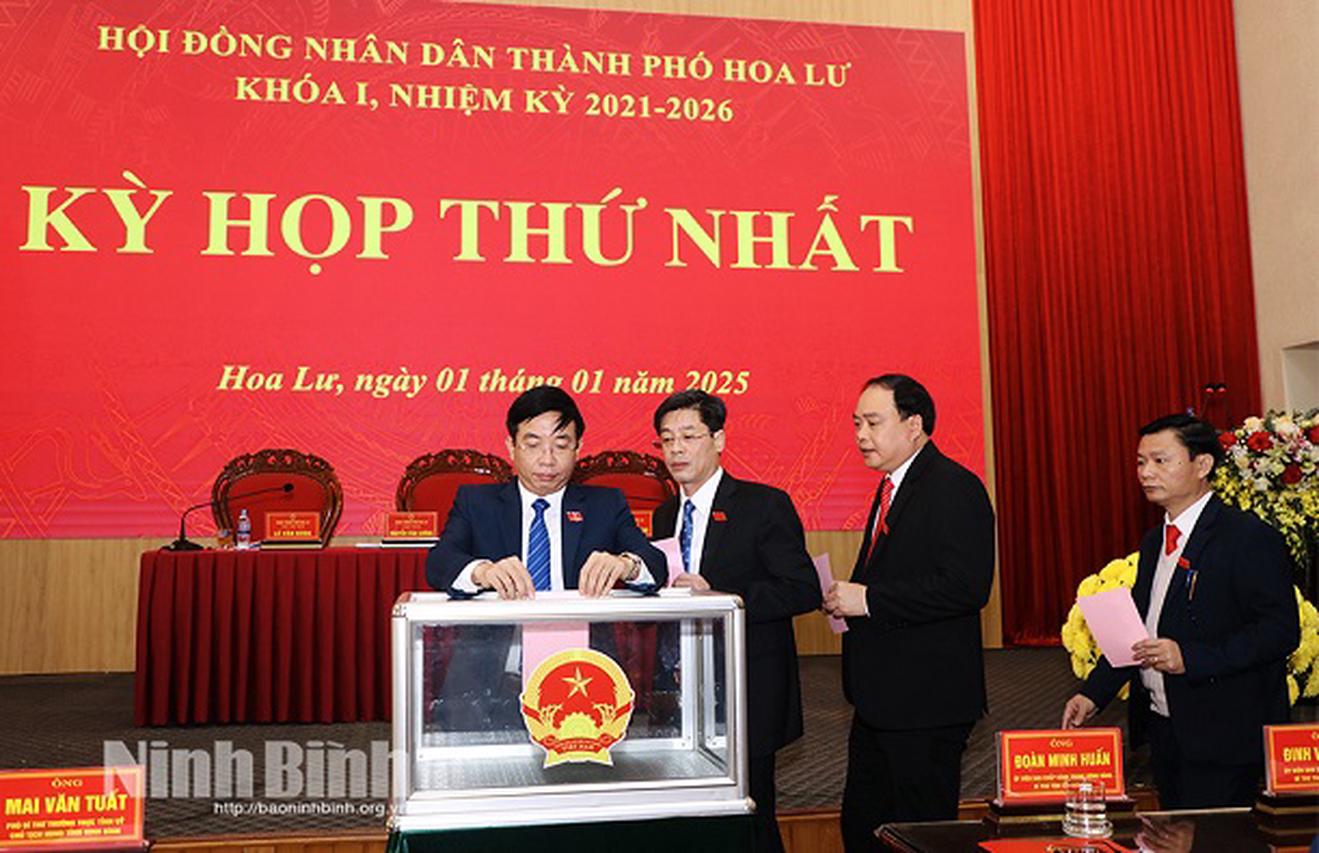 Với tinh thần dân chủ, trách nhiệm cao, HĐND TP Hoa Lư đã thực hiện quy trình bầu các chức danh Chủ tịch, các Phó Chủ tịch HĐND, các Trưởng ban, Phó Trưởng ban và số lượng thành viên các Ban HĐND; Chủ tịch, các Phó Chủ tịch UBND thành phố bằng hình thức bỏ phiếu kín.
