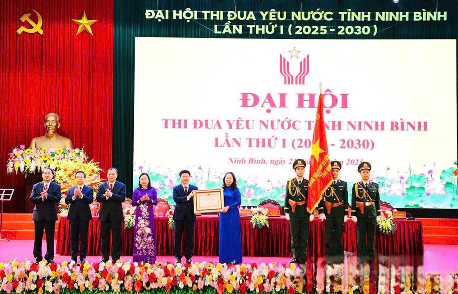 Thừa ủy quyền của Chủ tịch nước, đồng chí Phó Chủ tịch nước Võ Thị Ánh Xuân trao Huân chương Lao động hạng Nhất cho Đảng bộ, Chính quyền và Nhân dân tỉnh Ninh Bình. Ảnh: Báo Ninh Bình