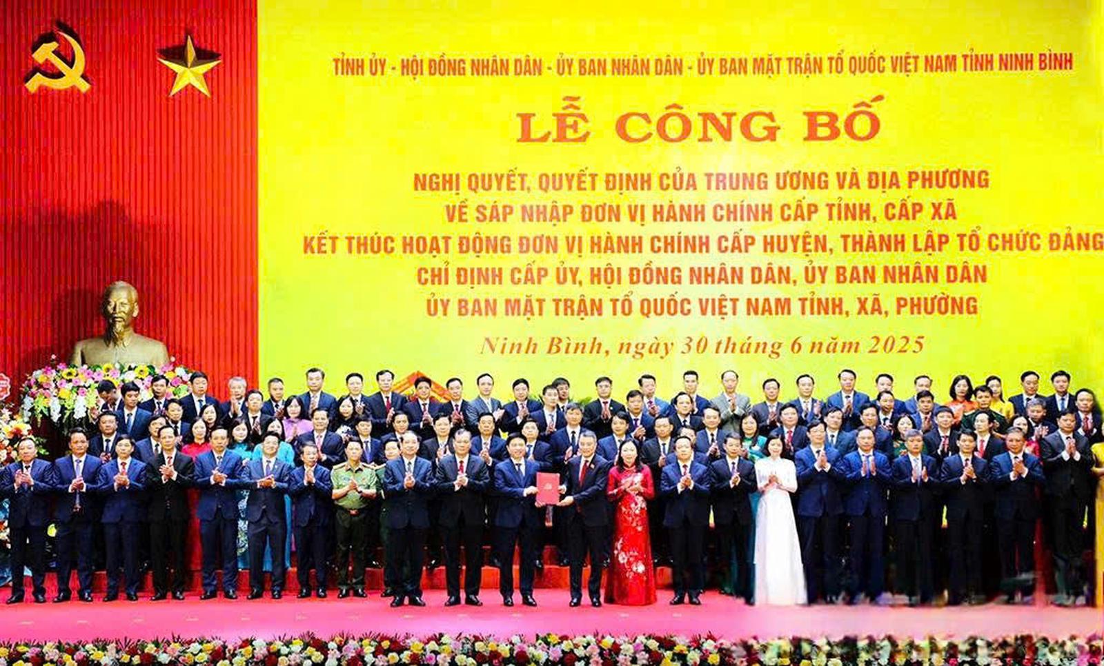(Thanh tra) - Ngày 30/6/2025, tại Trung tâm Hội nghị tỉnh, Tỉnh ủy, HĐND, UBND, Ủy ban MTTQ Việt Nam tỉnh Ninh Bình long trọng tổ chức Lễ công bố nghị quyết, quyết định của Trung ương và địa phương về sáp nhập đơn vị hành chính cấp tỉnh, cấp xã, kết thúc hoạt động đơn vị hành chính cấp huyện, thành lập tổ chức Đảng, chỉ định cấp ủy, HĐND, UBND, Ủy ban MTTQ Việt Nam tỉnh, xã, phường.