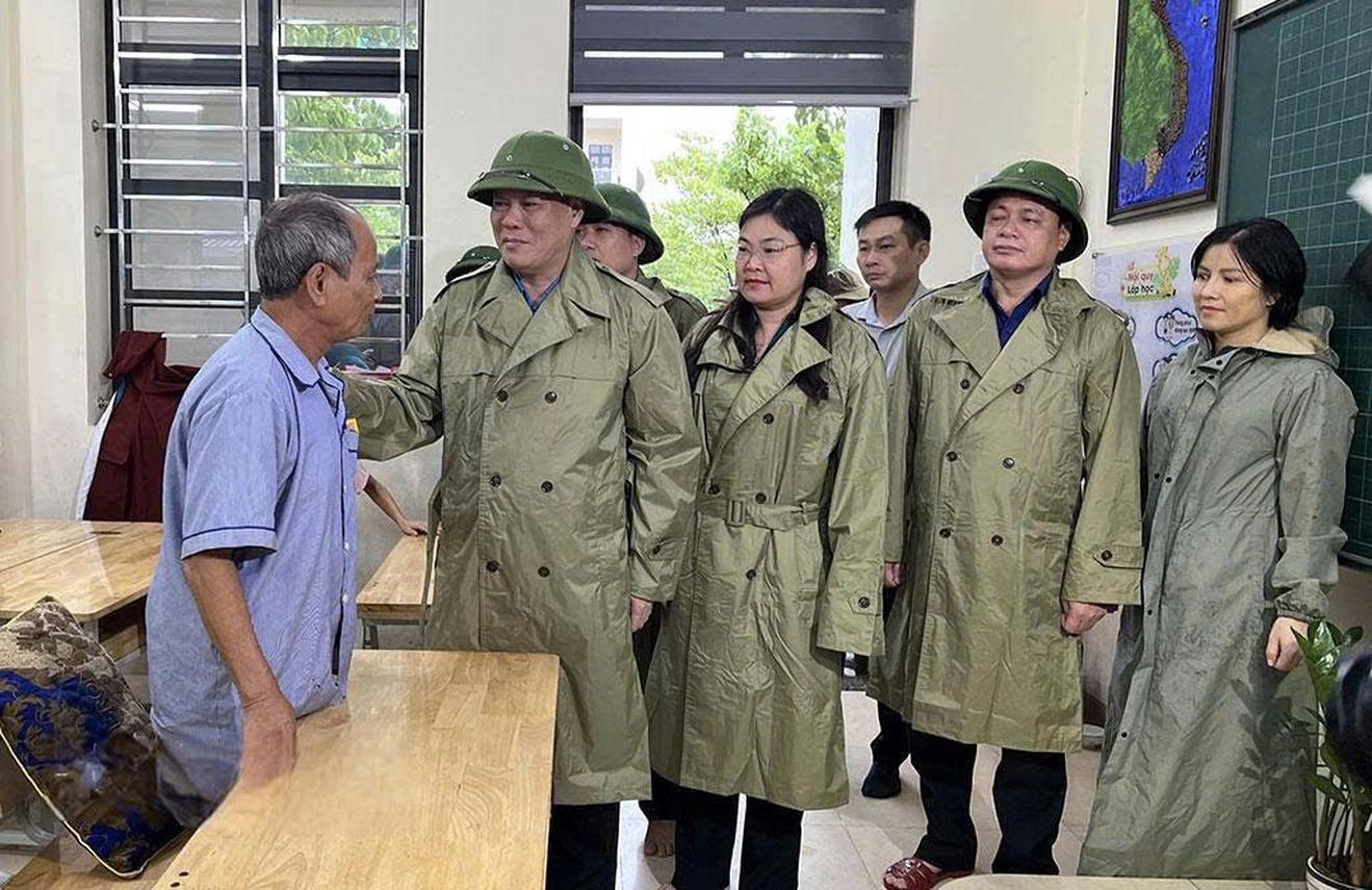 Phó Bí thư Tỉnh uỷ Ninh Bình Lê Quốc Chỉnh thăm hỏi, động viên người dân tránh trú bão tại Trường Tiểu học Nguyễn Tất Thành. Ảnh: BNB