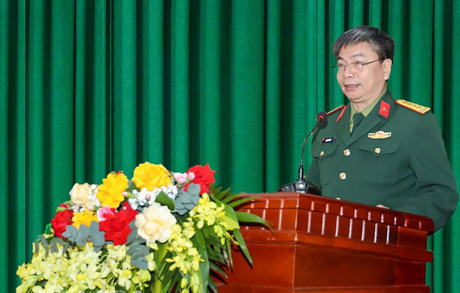 Đại tá Bùi Xuân Bình, Chính ủy Bộ Chỉ huy Quân sự tỉnh Ninh Bình phát biểu tại hội nghị. Ảnh: Văn Huỳnh