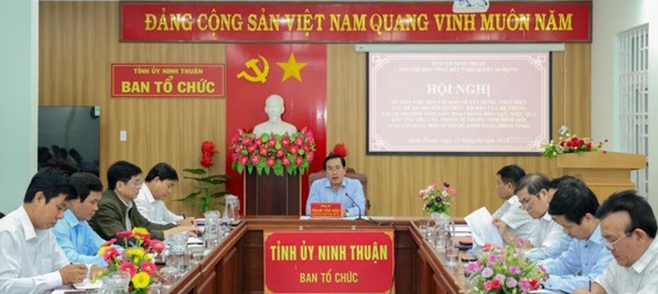 Theo báo cáo của ông Lâm Đông, Trưởng Ban Tổ chức Tỉnh ủy, đến thời điểm hiện nay, việc thực hiện sắp xếp tổ chức bộ máy hệ thống chính trị của Ninh Thuận đảm bảo đúng tiến độ đề ra. Ban Tổ chức Tỉnh ủy đã tham mưu Ban Thường vụ Tỉnh ủy ban hành các quyết định: Kết thúc hoạt động của Ban Bảo vệ chăm sóc sức khỏe cán bộ tỉnh, chuyển nhiệm vụ về Ban Tổ chức Tỉnh ủy, Sở Y tế và Bệnh viện Đa khoa tỉnh; kết thúc hoạt động 7 Bạn chỉ đạo của Tỉnh ủy; tham mưu Ban Thường vụ Tỉnh ủy ban hành các đề án: Hợp nhất Ban Tuyên giáo Tỉnh ủy và Ban Dân vận Tỉnh ủy; kết thúc hoạt động của Đảng ủy khối Cơ quan - Doanh nghiệp tỉnh; thành lập Đảng bộ Các cơ quan đảng tỉnh và Đảng bộ UBND tỉnh; tham mưu Ban Thường vụ Tỉnh ủy chỉ đạo Đảng đoàn HĐND tỉnh ban hành Đề án sáp nhập Ban Văn hóa-Xã hội và Ban Dân tộc thuộc HĐND tỉnh; tên gọi mới sau khi sáp nhập: Ban Văn hóa-Xã hội.
