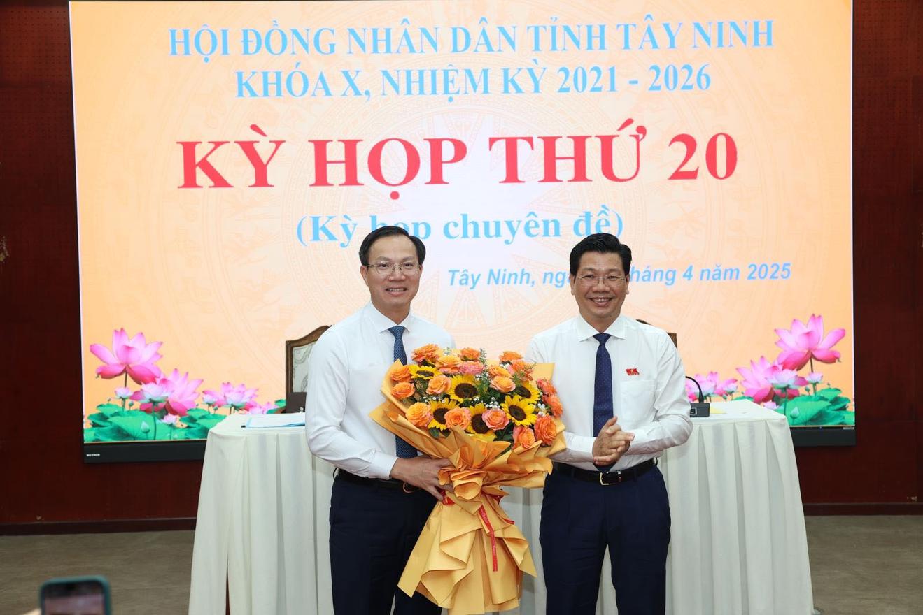 Bí thư Tỉnh ủy, Chủ tịch HĐND tỉnh Tây Ninh Nguyễn Mạnh Hùng (bên phải) tặng hoa chúc mừng ông Đoàn Trung Kiên. Nguồn: tayninh.dcs.vn