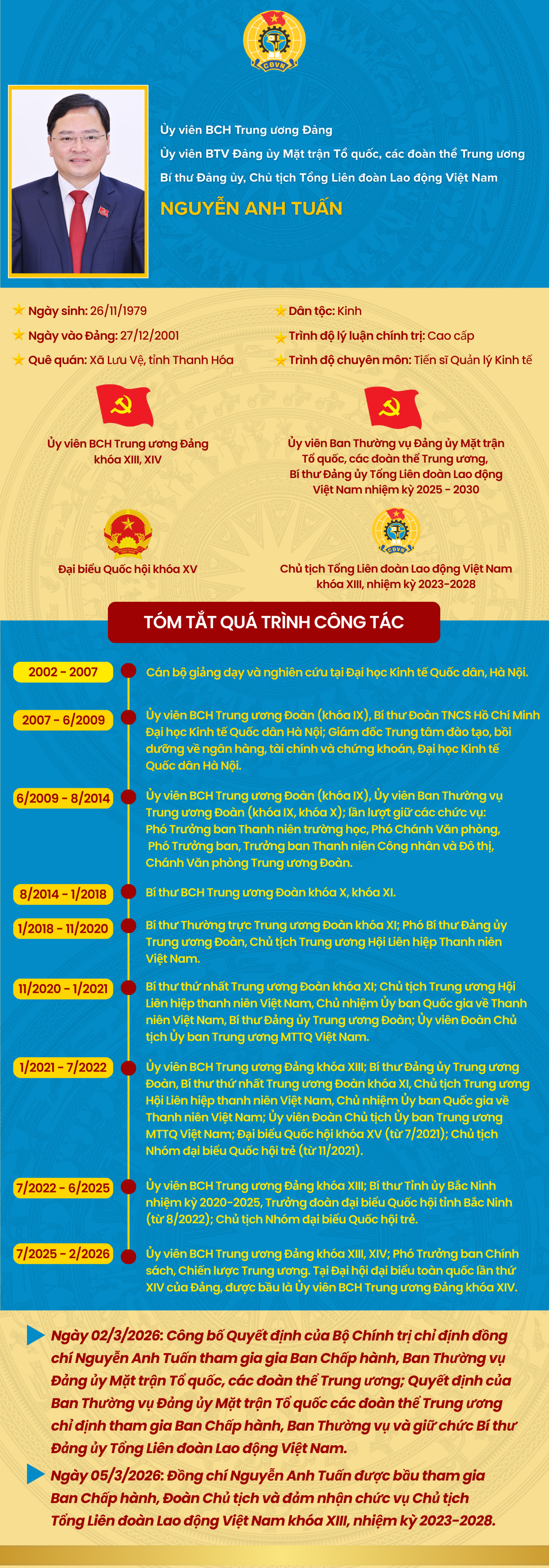 Trước đó, Đảng ủy MTTQ, các đoàn thể Trung ương đã công bố quyết định của Ban Thường vụ Đảng ủy MTTQ, các đoàn thể Trung ương chỉ định ông Nguyễn Anh Tuấn, Ủy viên Ban Thường vụ Đảng ủy MTTQ, các đoàn thể Trung ương tham gia Ban Chấp hành, Ban Thường vụ và giữ chức Bí thư Đảng ủy Tổng LĐLĐ Việt Nam, nhiệm kỳ 2025 - 2030.