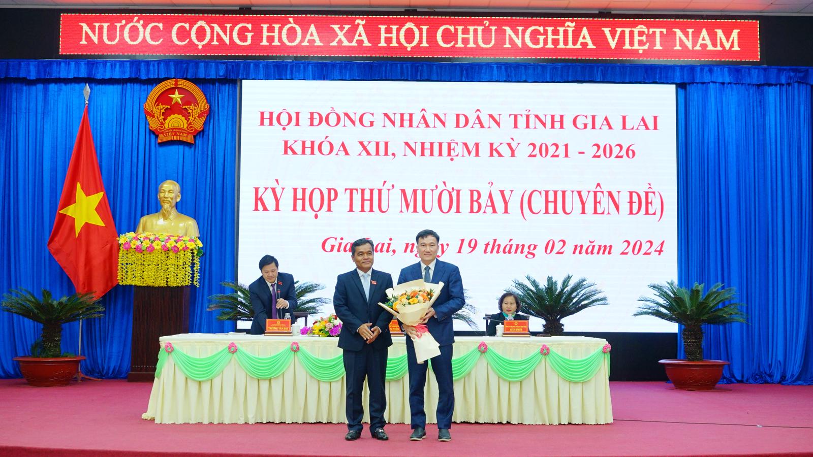 Bí thư TTỉnh ủy, Chủ tịch HĐND tỉnh Gia Lai tặng hoa chúc mừng tân Phó Chủ tịch UBND tỉnh. Ảnh: N.G