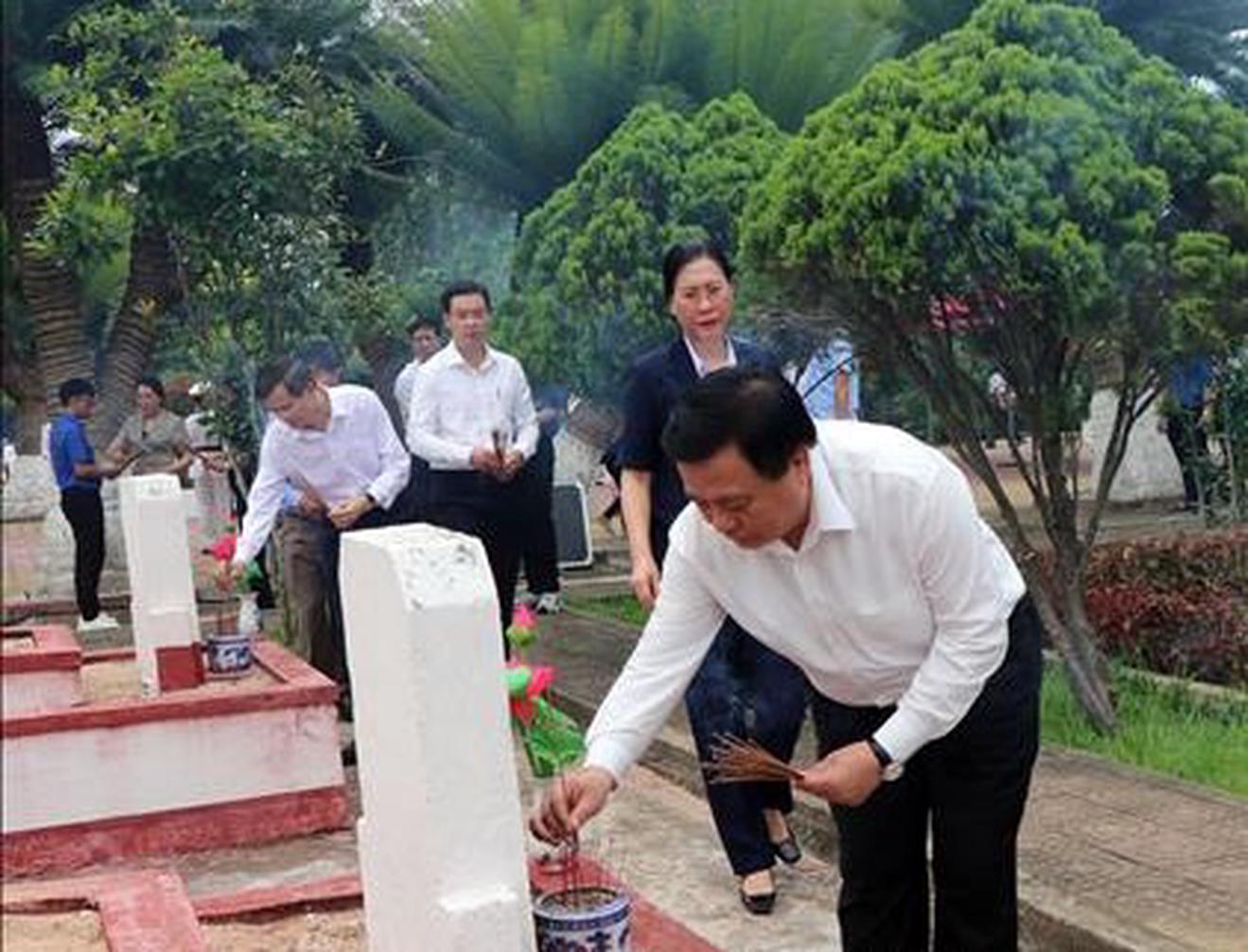 Đồng chí Nguyễn Xuân Thắng thắp hương tại Nghĩa trang liệt sĩ phường Cẩm Thành. Ảnh: TL