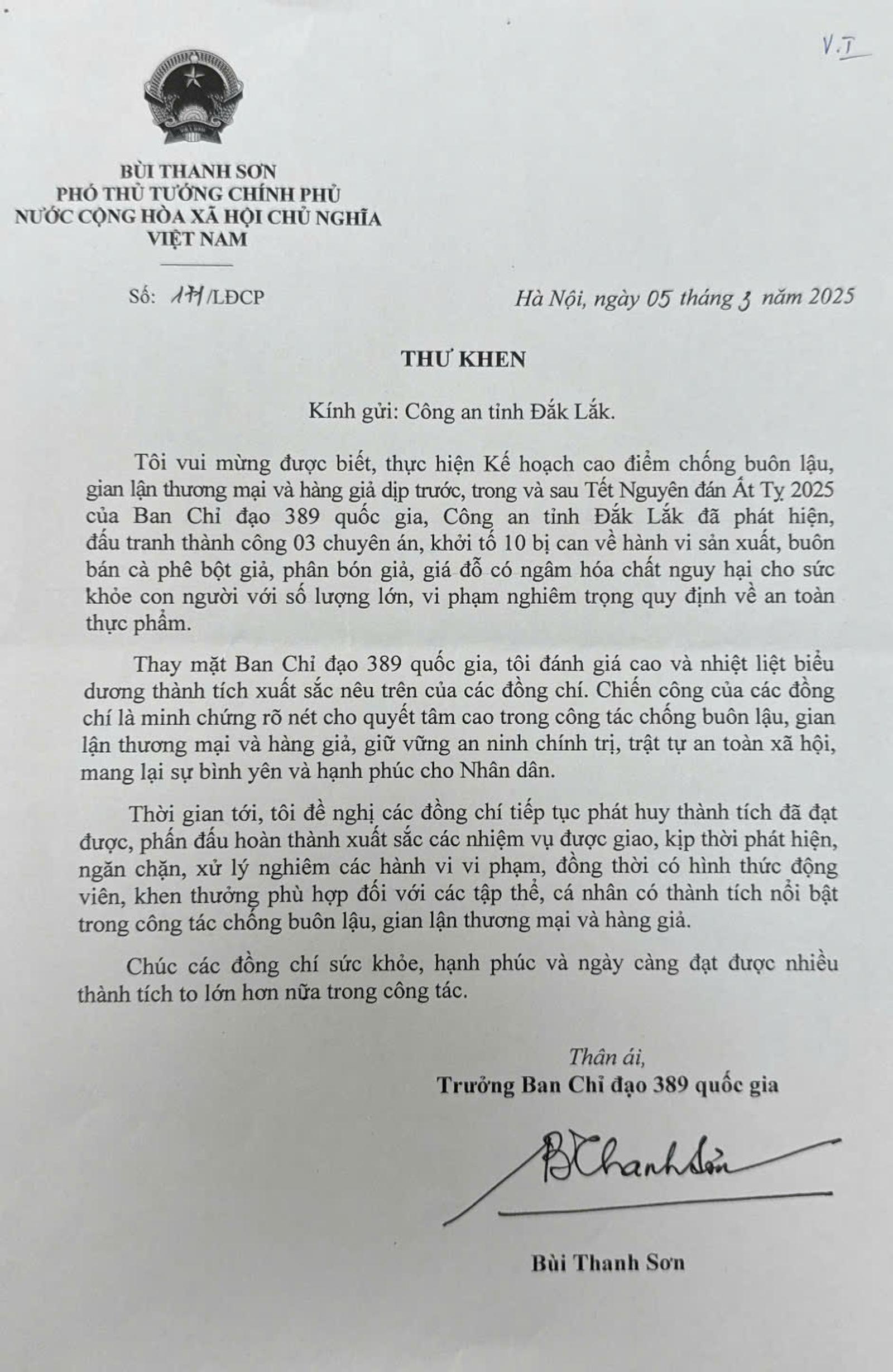 Trong thư, thay mặt Ban Chỉ đạo 389 quốc gia, Phó Thủ tướng Bùi Thanh Sơn đánh giá cao và biểu dương thành tích xuất sắc của Công an tỉnh Đắk Lắk.