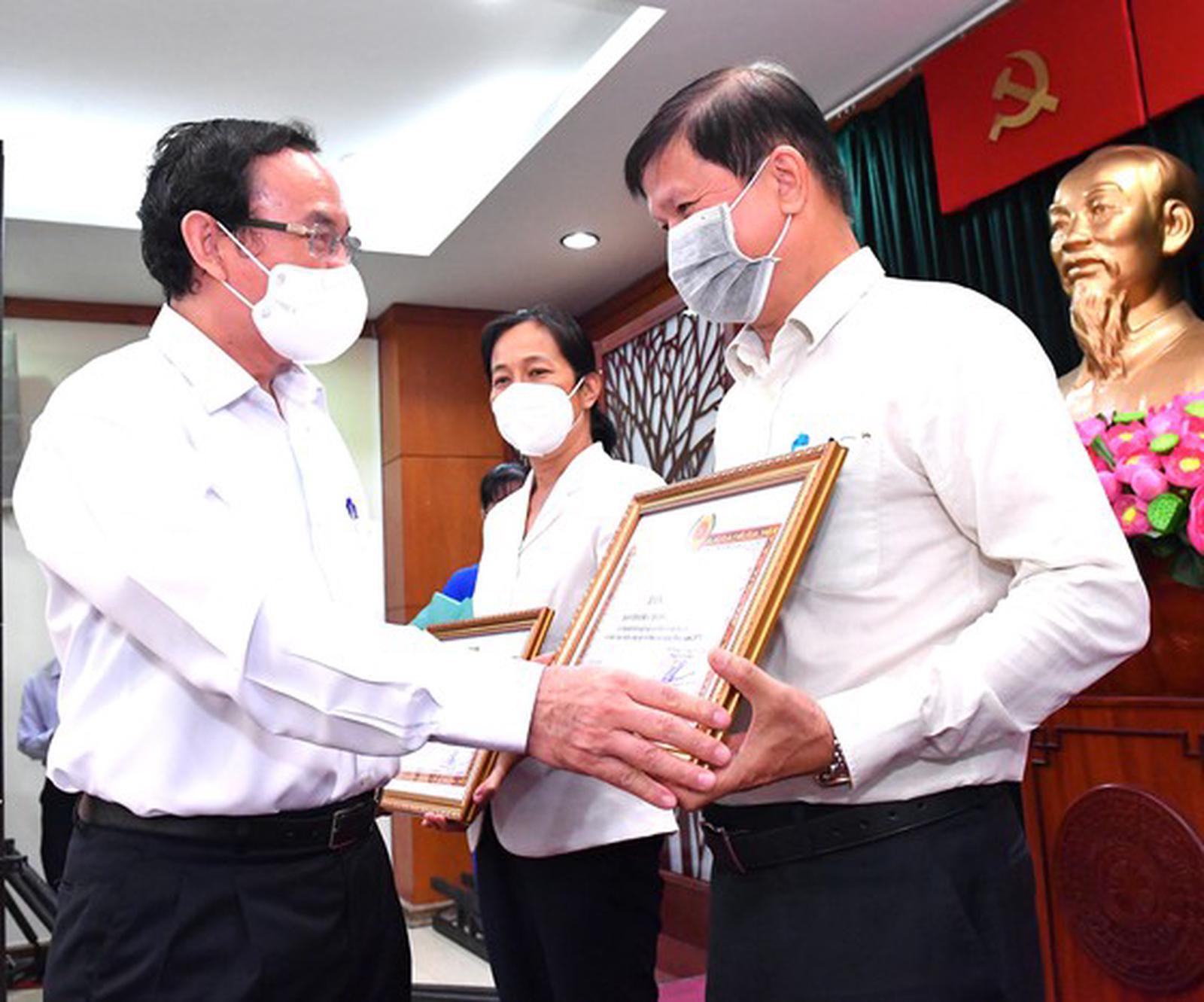 Bí thư Thành ủy TP HCM Nguyễn Văn Nên trao Bằng khen cho các đơn vị. Ảnh: Việt Dũng