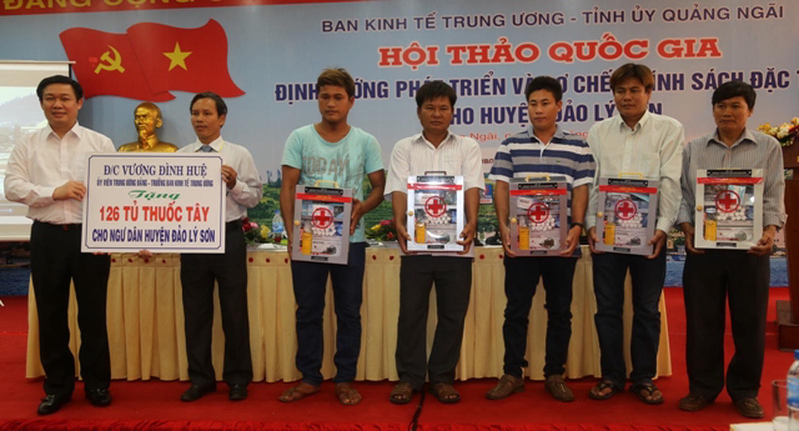 Trưởng Ban Kinh tế Trung ương Vương Đình Huệ đã trao tặng 126 tủ thuốc trị giá khoảng 300 triệu đồng cho ngư dân Lý Sơn